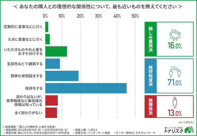 ・【挨拶程度派(71.0%)】:「玄関先などで雑談する(8.0%)」「簡単な世間話をする(18.3%)」「挨拶をする(44.7%)」と回答