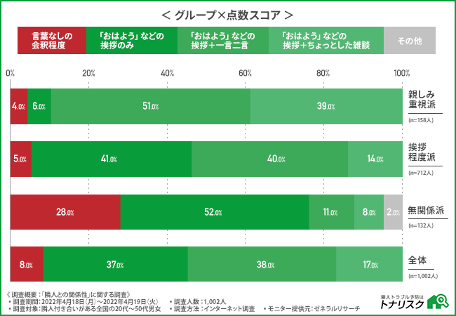 「親しみ重視派」「挨拶程度派」「無関係派」のグループ別に調査してみました。