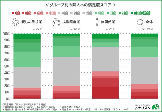 ・隣人への満足度を100点満点でいうと、全体平均は54点。70点以上(隣人ガチャあたり)は36%、30点以下(隣人ガチャハズレ)は22%