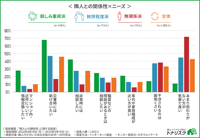 株式会社トナリスク(本社所在地:東京都豊島区、代表取締役:松尾 大史)は、隣人付き合いがある全国の20代~50代男女を対象に、「隣人との関係性」に関する調査を実施しました。