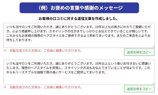 どんな口コミにも対応:お褒めの言葉や感謝のメッセージ、時にはクレーム対応にも適したトーンで返信文を生成。