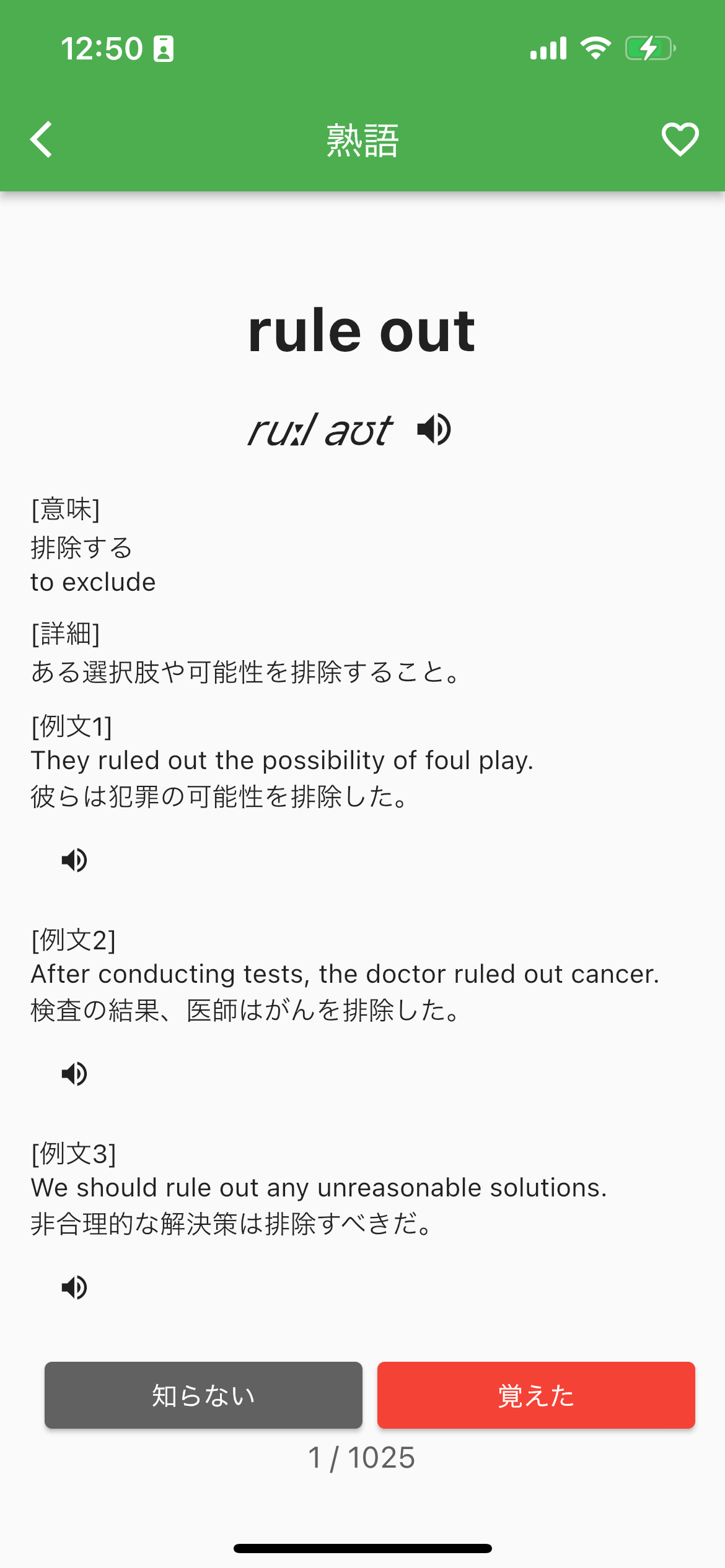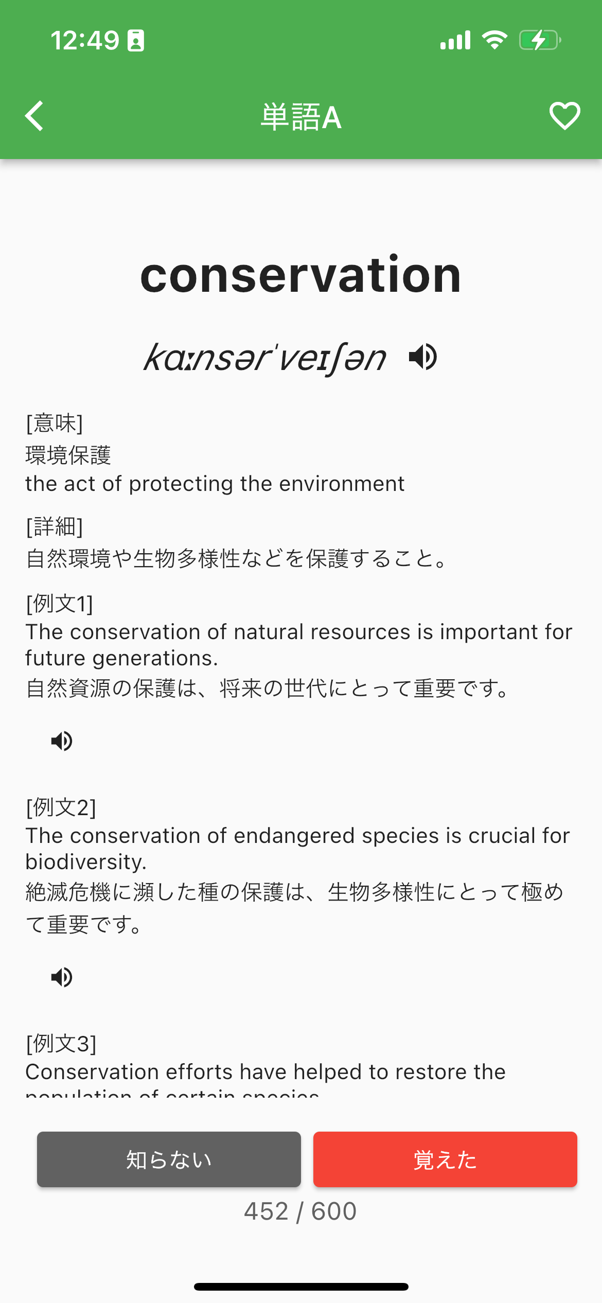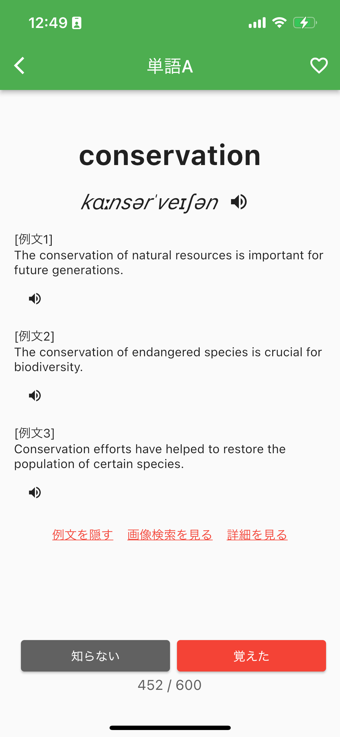 また、アプリは実践的な学習をサポートします。各単語には、複数の例文が提供され、その単語がどのように使われるかを理解するのに役立ちます。さらに、覚えた単語はマークして表示されなくする機能も搭載しており、効率的な復習が可能です。
