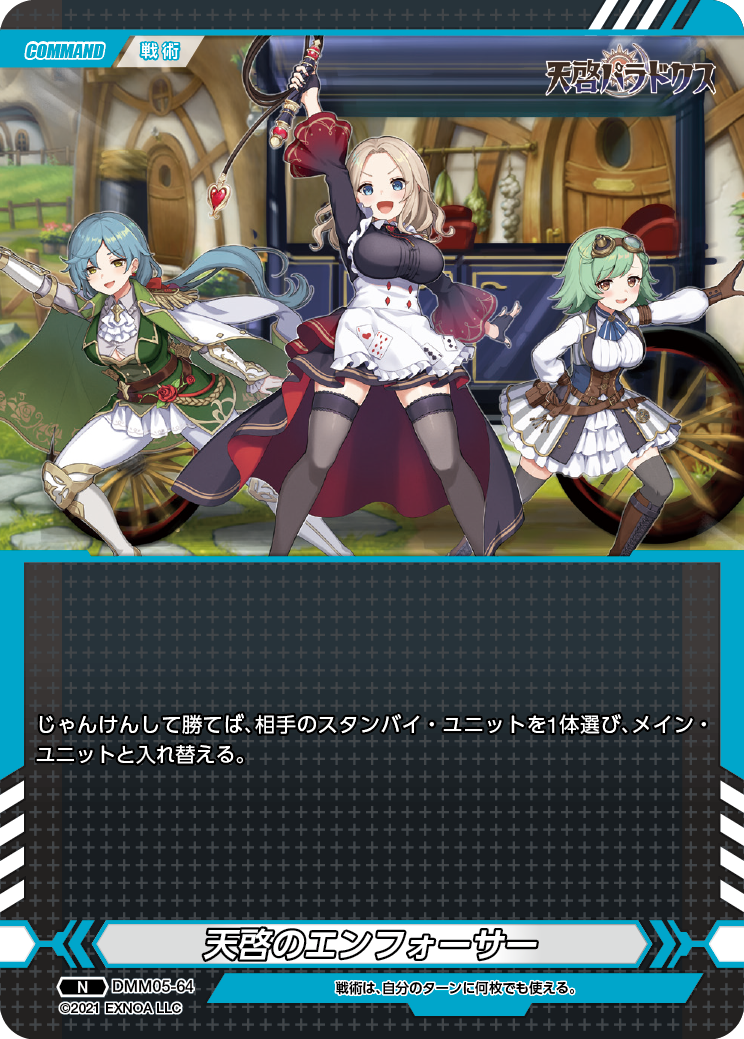 3DタクティクスRPG『天啓パラドクス』のキャラクターたちが登場する、DMM GAMESと株式会社TCGのタッグでお送りする新作トレーディングカードゲームです。本商品は12ヶ月連続でリリースされるDMM GAMESトレーディングカードコレクション(注1)の第5作目として発売を予定しており、同コレクション内12作品であれば異なる作品(注2)とも戦うことができる戦略性、コレクション性ともに満足いただけるトレーディングカードゲームとなっております。
