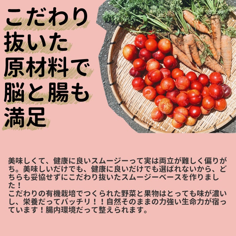 九州各地の農家さんが有機農法や無農薬/減農薬で育てた野菜・果物を新鮮な状態で最新の瞬間冷凍技術で冷凍し、真空パックしました。 濃縮還元果汁、甘味料、合成着色料、増粘剤などは使用せず無添加。完成したスムージーではなく、簡単にご自宅のミキサーでスムージーが作れるように野菜・果物を1杯分ずつオリジナルの配合レシピで一つ一つパッケージしました。