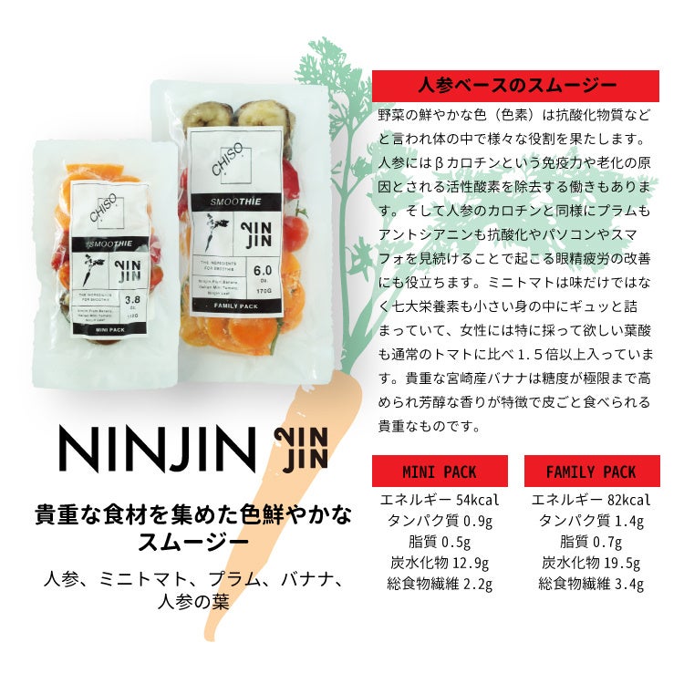 フレーバー:THE ONE(ケールベース),NINJIN(人参ベース),TANGERIN(みかんベース)