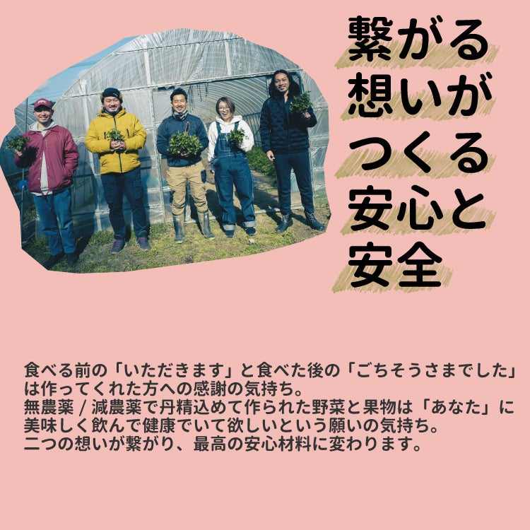 原材料は私たちが自ら農家さんを訪問してダイレクトトレードしました。畑を見ながら膝と膝を突き合わせてお話を聞き、ときにはお手伝いをしたり、その場で味を確認。一般の流通に載らない希少で手に入りにくいものばかりです。ミネラルウォーターやお好きな割り物でミキサーにかけスムージーを作り飲んでいただくという体験を敢えて皆さんにしてもらうことで、健康になるだけでなく農家さんのリアルを知ってもらい”食”を通し未来を紡ぐ一歩を踏み出すきっかけにしてもらいたいと思っています。