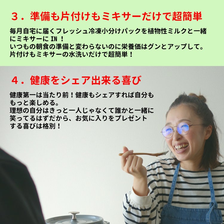 朝食の置き換えやご家族でのシェアには従来のファミリーパック、ジュース代わりの1杯としてや今の食事にプラスしたい方にはミニパックという風に、ライフスタイルに合わせてお選びいただけます。