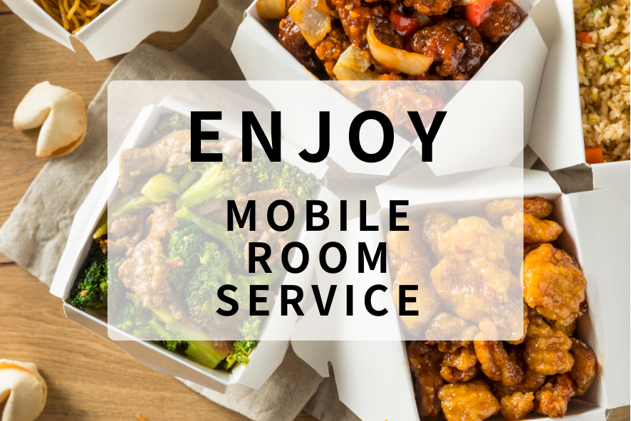 ホテル専用モバイルオーダーで簡単に注文、指定時間に飲食店スタッフがお部屋まで直接お届け。