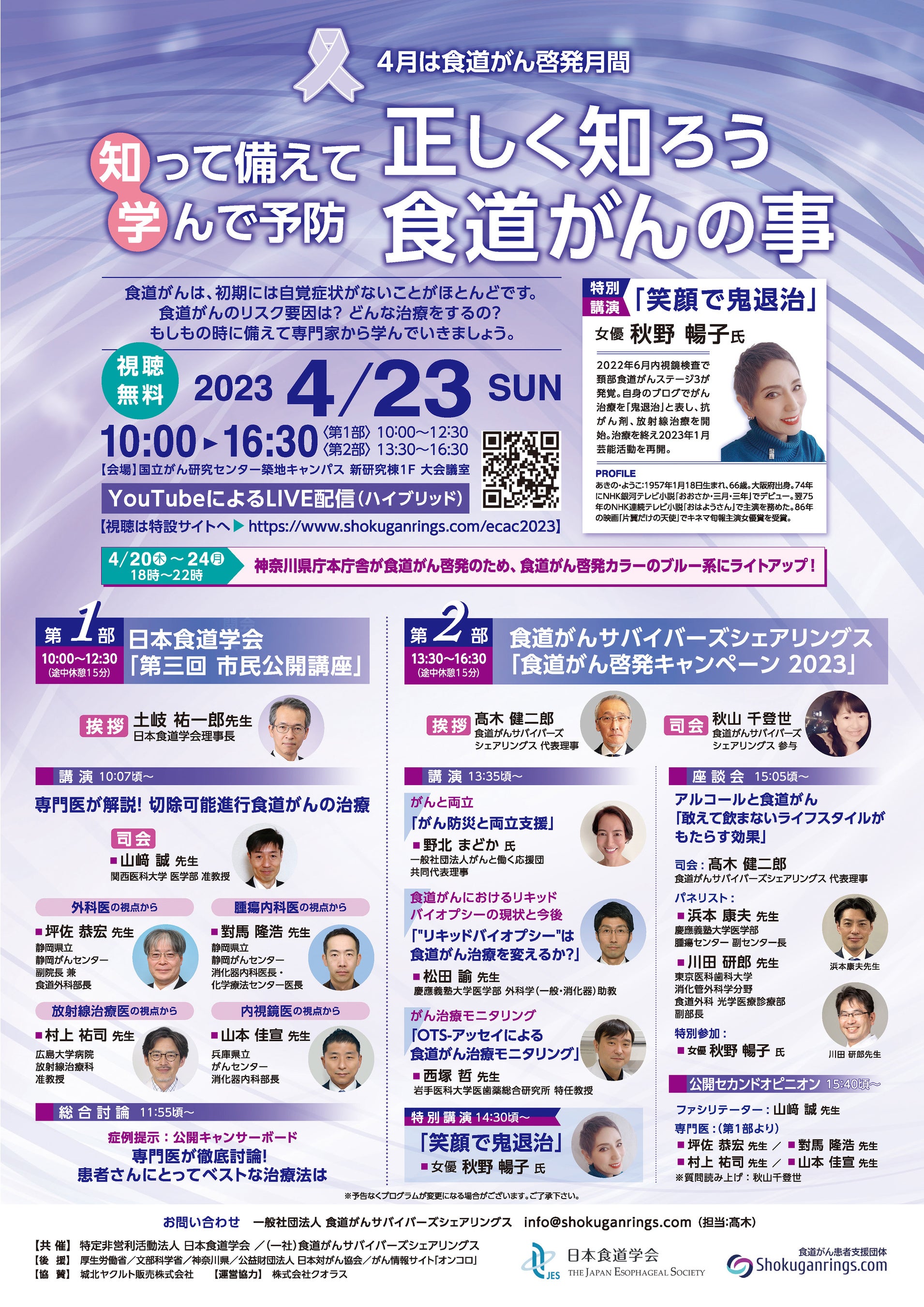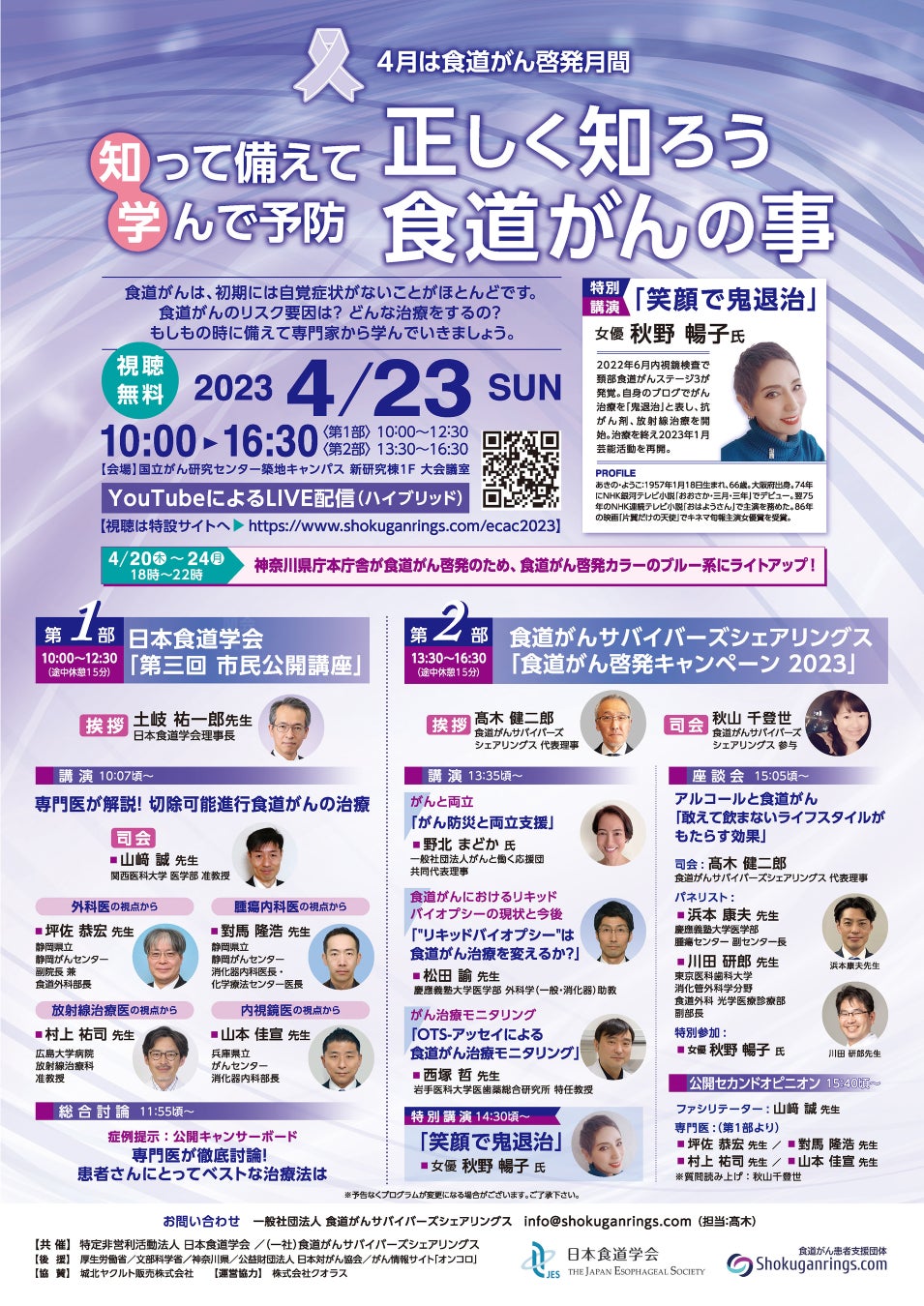 <4月は食道がん啓発月間/特別講演に女優 秋野暢子 氏>無料市民公開講座「知って備えて・学んで予防 正しく知ろう食道がんの事」▼2023年4月23日(日):国立がん研究センター築地キャンパスで開催