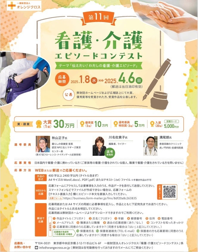 一般財団法人オレンジクロスは第10回看護・介護エピソードコンテストの作品を2025年1月8日(火)~2025年4月6日(日)で募集いたします。