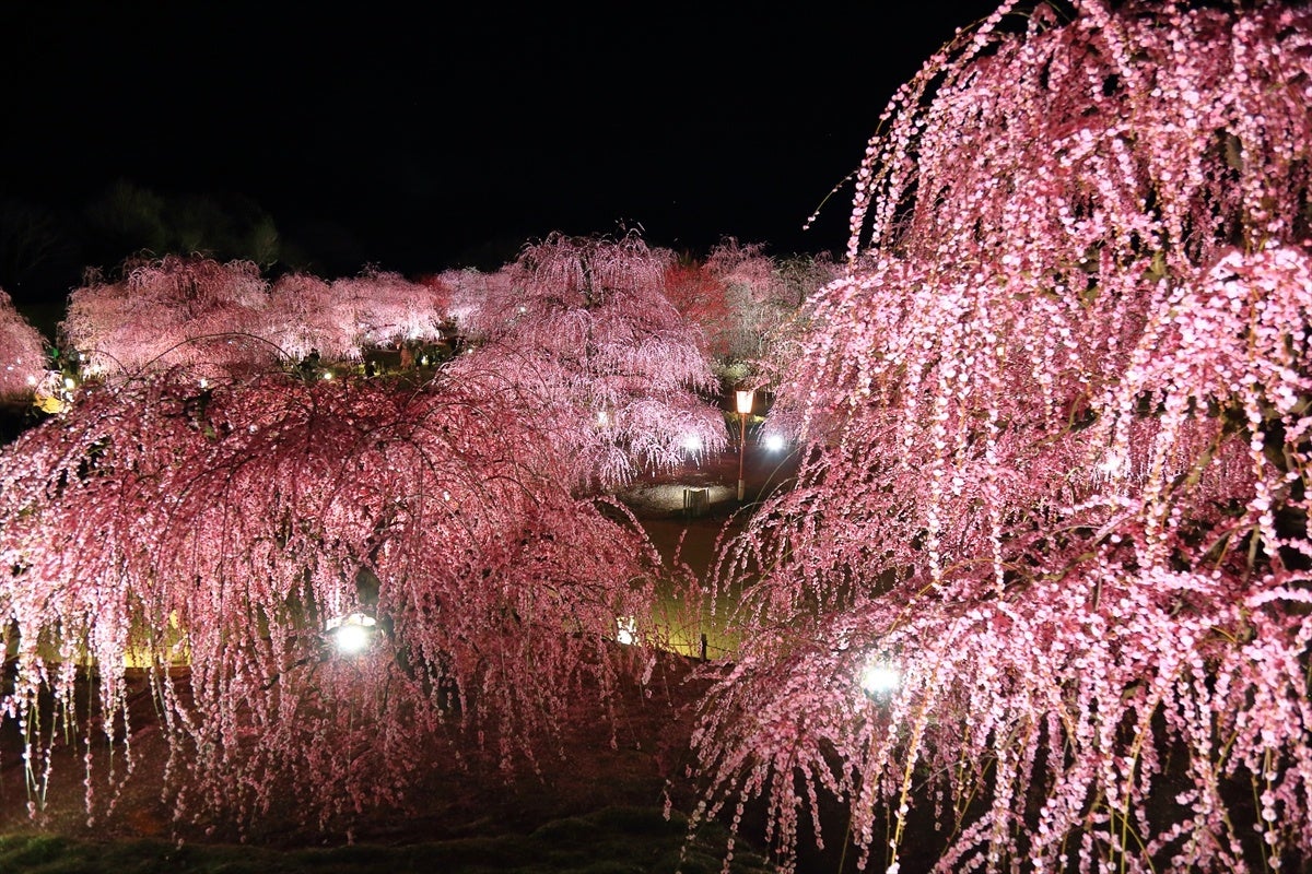 また、見頃の時期には夜間ライトアップも行います。黄昏の山の稜線を望みながら、あるいは漆黒の闇に包まれて、シャンデリアのように照らし出されたしだれ梅の幽玄な世界は、当園でしか味わえない感動の絶景として人気を集めています。