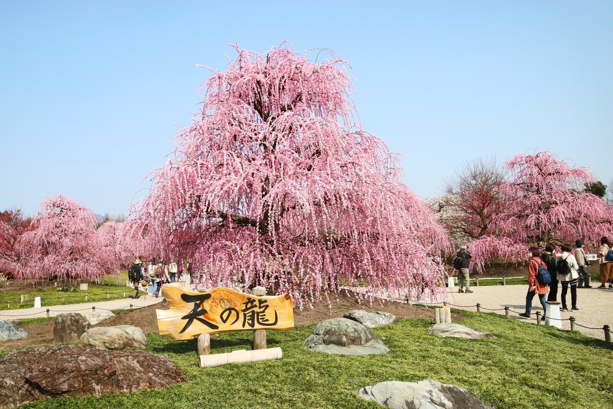 【しだれ梅】「鈴鹿の森庭園」が3月中旬から見頃に。ライトアップも実施中。日本最古の呉服しだれ「天の龍」「地の龍」をはじめ約200本の梅の名木が立ち並ぶ絶景
