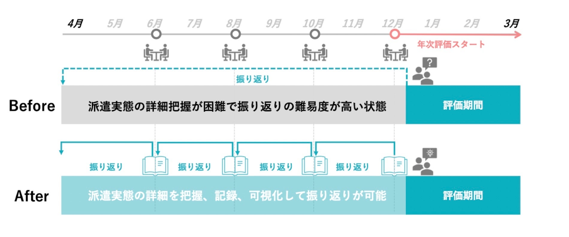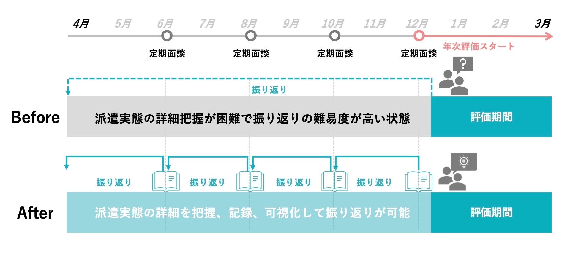 これまで労働者派遣法により派遣会社に義務化された派遣社員の評価を、派遣会社の負担を最小限に抑えつつ、評価運用を実施することが出来る評価管理ツールを提供してきました。当社では、評価を効果的に行い派遣社員の処遇改善の可能性を高める為、また、派遣社員の感じている不安や今後のキャリアの希望等を把握し、安定就業へのサポートや次の派遣先への就業サポートの強化をする為にも、派遣社員との定期面談等でのコミュニケーションが大切だと考えております。