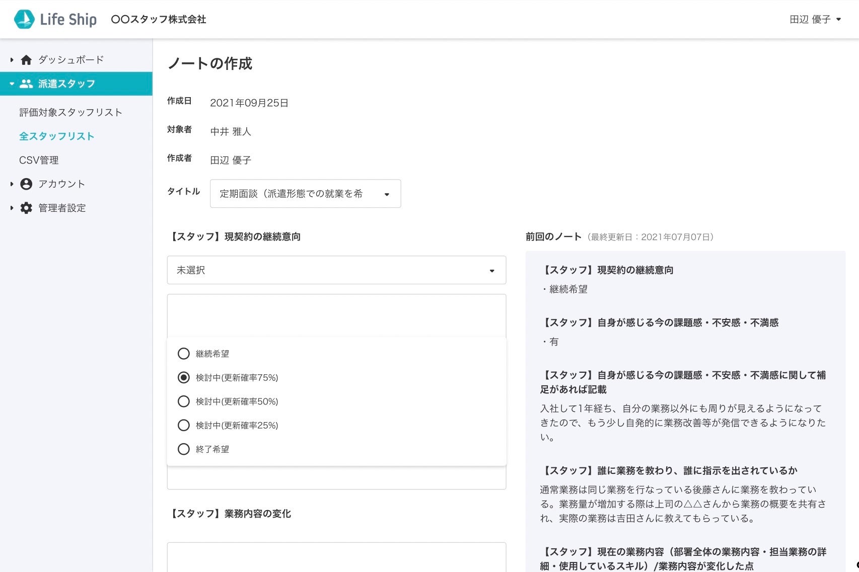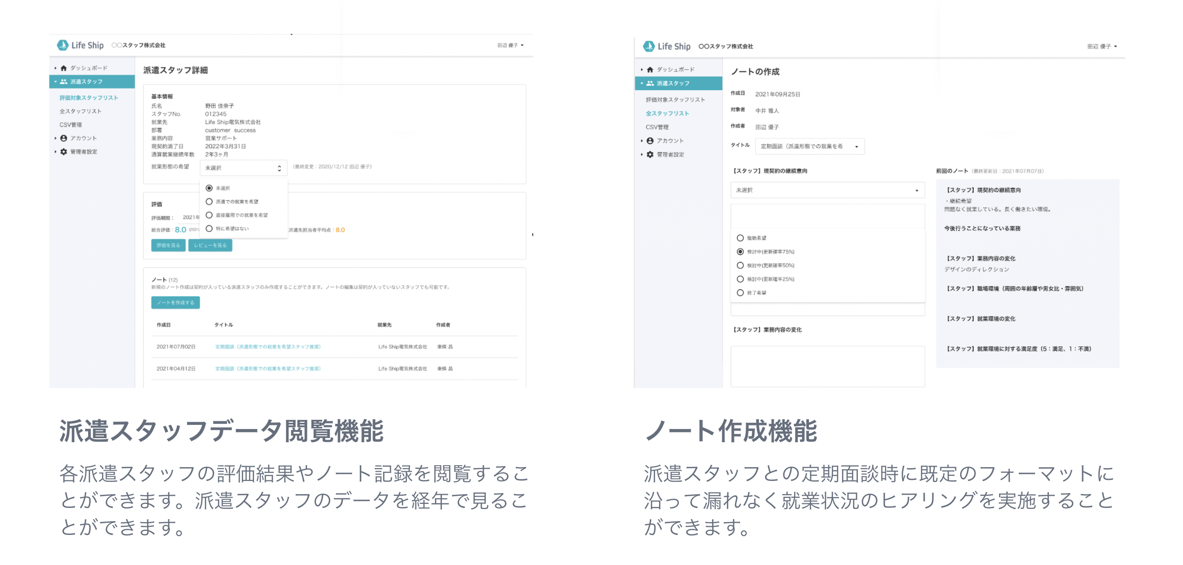 Life Ship株式会社(本社:東京都港区、代表取締役社長:田形 正広)は、派遣社員の評価をスムーズに行うことが出来る評価管理ツール「Life Ship(ライフシップ)」に、派遣社員との定期的な面談内容を記録できる「ノート機能」を、2022年4月に新搭載致します。