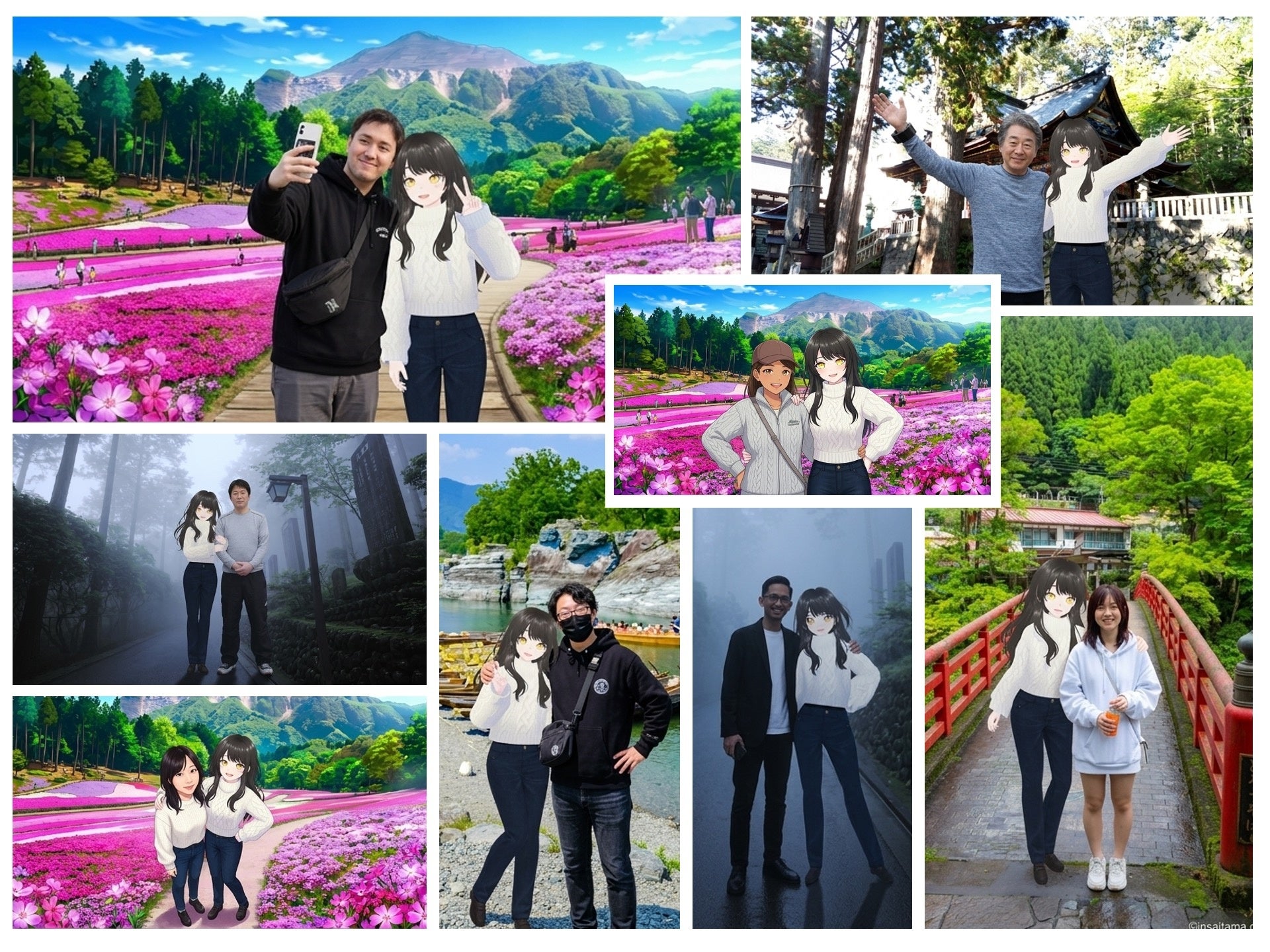 横瀬・秩父の風景を背景に、アリス/アリサと写真が撮れます。アリス/アリサも一緒にポーズをとるAR合成で楽しい旅を演出します。