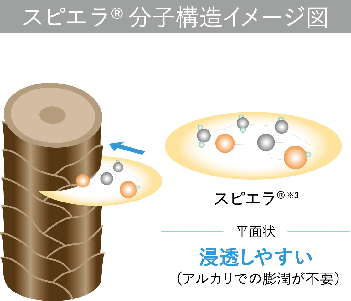 スピエラⓇ※3は、分子構造が平面状になっているため、髪が膨潤していない状態でも