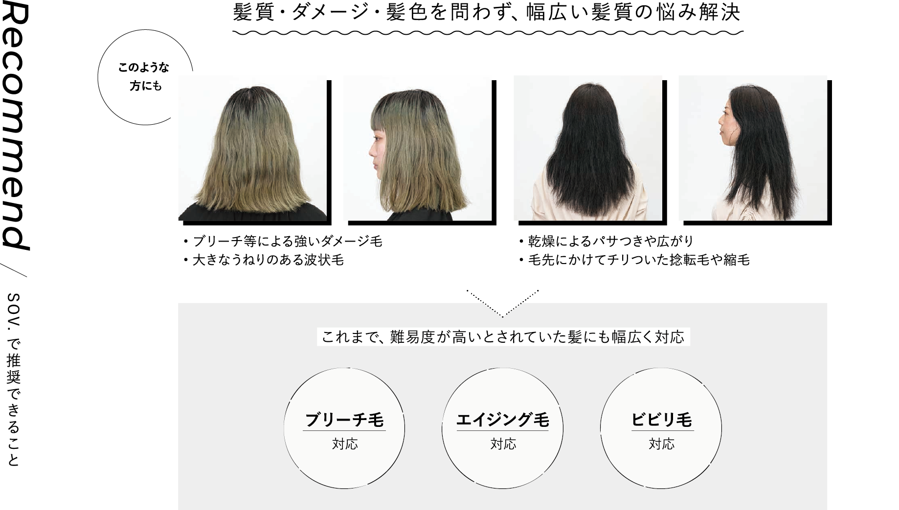 酸性ストレートの第一人者、シャウルデッサン・黒木利光氏監修のもと、開発されたsov.は、ヘアカラーやブリーチ等によるダメージや、乾燥によるパサつきや広がり、うねり・縮毛など、これまで難易度が高いとされていた髪にも幅広く対応。