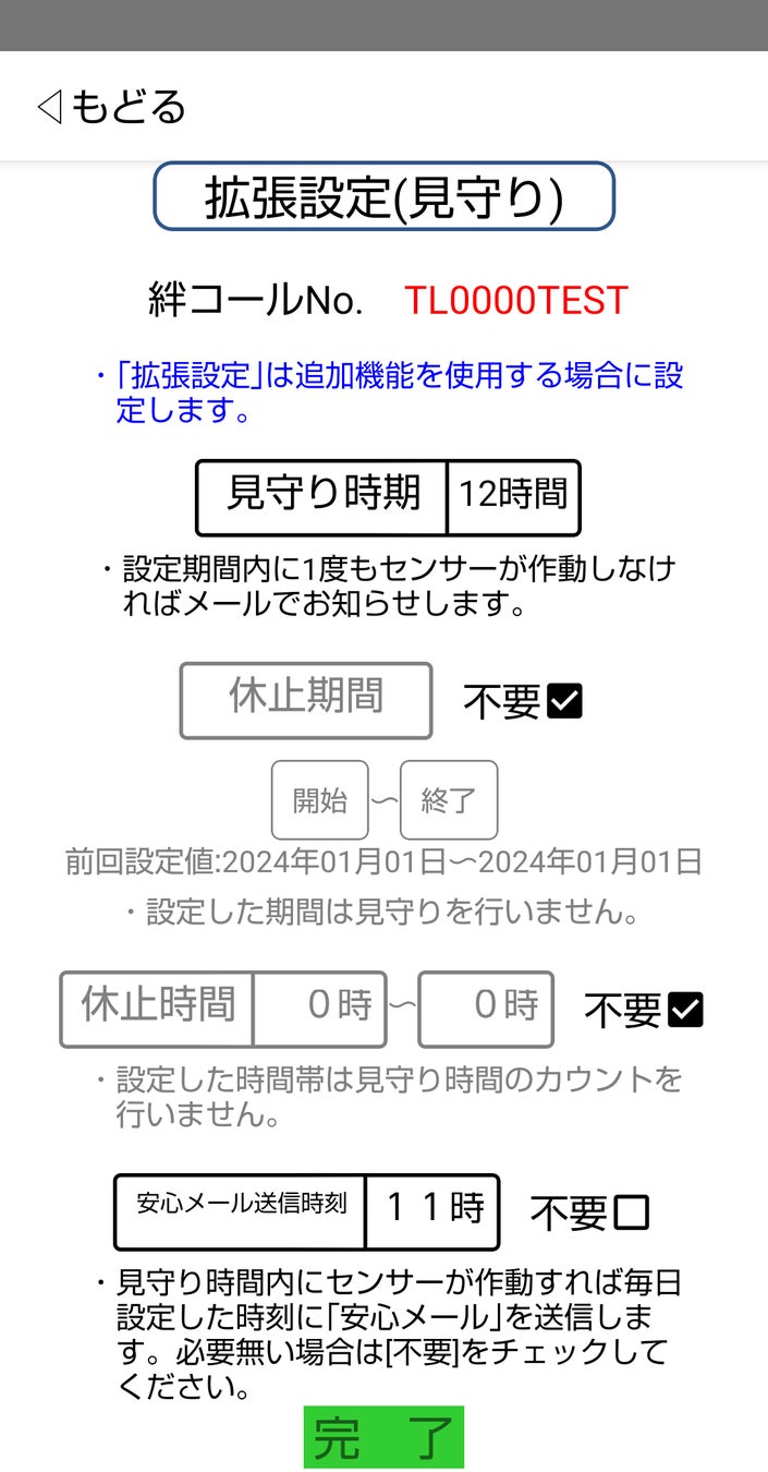 拡張設定では、見守り時間<12時間・24時間・48時間>の設定および旅行や入院等