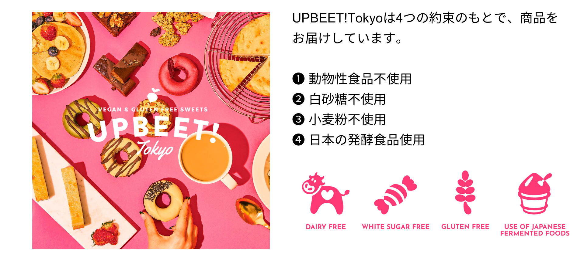 「毎日や人生を"ワクワク=Up beat"させるヴィーガンスイーツを届けたい」というミッションを掲げ、こだわりの100%植物性食材から誕生したヴィーガングルテンフリースイーツ。
