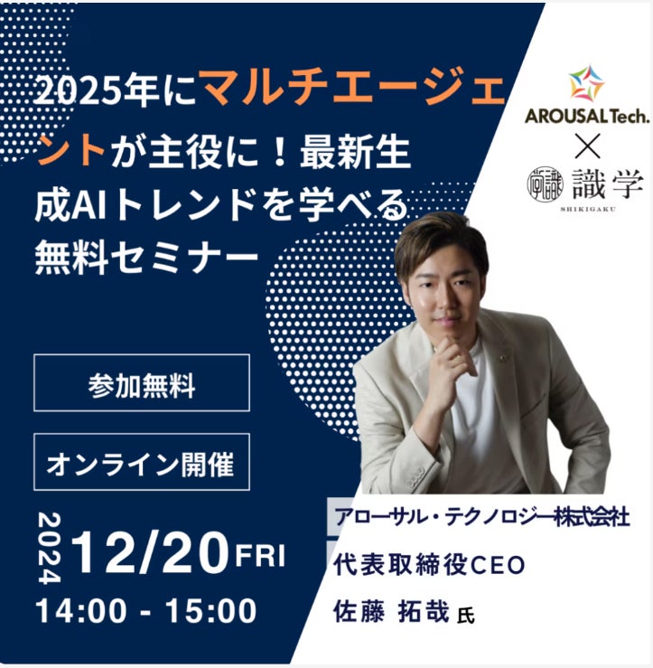 12/20に開催される「2025年にマルチエージェントが主役に!最新生成AIトレンドを学べる無料セミナー」に代表取締役CEO 佐藤拓哉が登壇します。