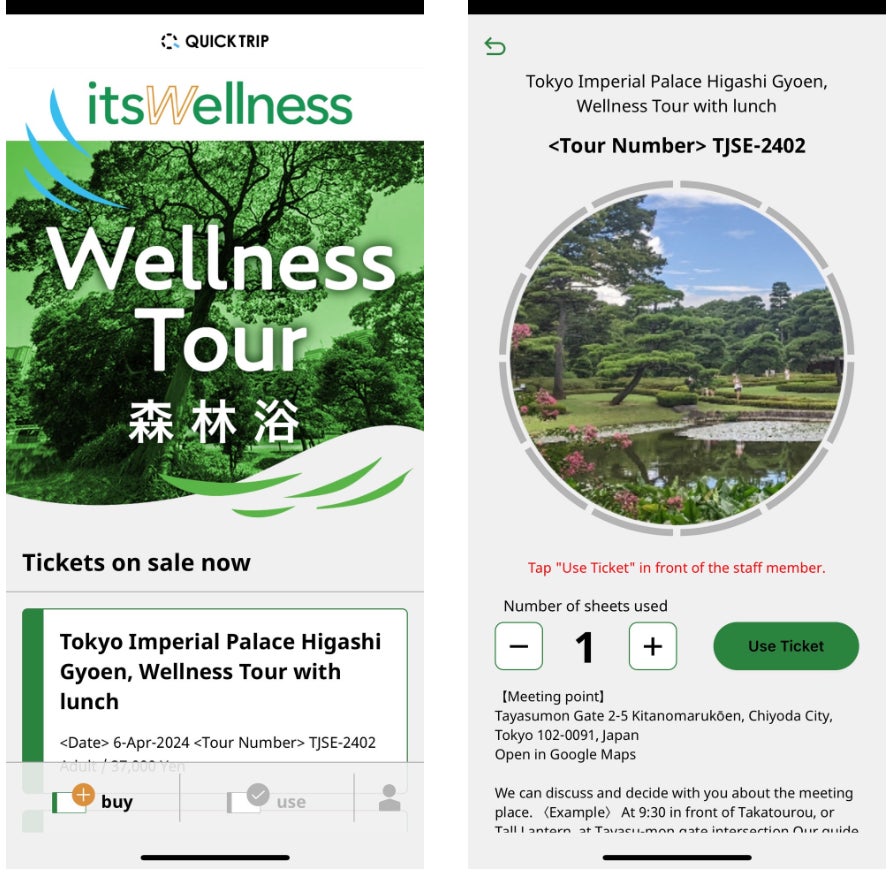 これまで「森林浴ウェルネスツアーチケット」は、オンラインでツアー代金を支払い、ツアー日程を事業者と参加者で調整後、ツアー当日に、ツアーガイドが紙のリストを参照し参加者を確認する方法で運用を行っていました。「QUICK TRIP」でのチケット販売によって、ツアー代金の支払いやツアー日程調整をモバイルで完結できるようになり、ツアー参加者の利便性が向上します。