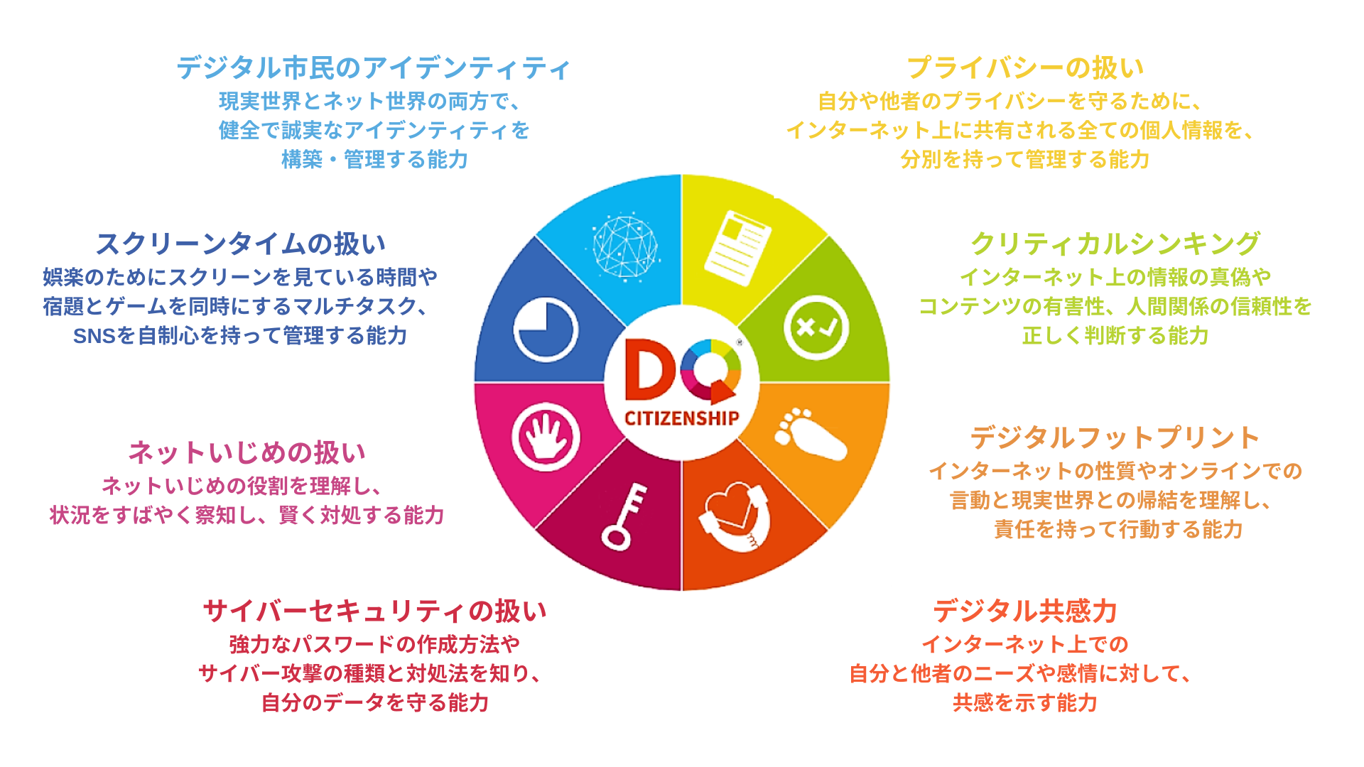 これまで、禁止や制限といった消極的なICTの使い方の指導やこの分野に専門性を持たない指導教員の負担が指摘されてきた。しかし、児童生徒1人ひとりがICT端末を持ち、家庭と学校での連続的な学びが推進される今、ICTの活用を前提として、それらをどのように使っていくのか自ら考え、判断し、行動する基盤を育てる教育が必要とされている。こうした課題を解決すべくDQ Worldは、時間や場所を選ばず、アニメーションやクイズ、キャラクターとの擬似チャットなどを通じて、児童生徒が楽しく主体的に学習を進めるための学習を提供している。DQ Worldで学習可能なデジタル・シティズンシップスキルは、下図の8つのスキルである。