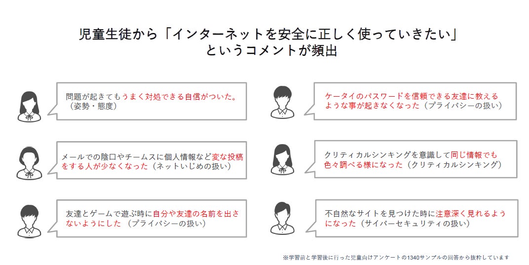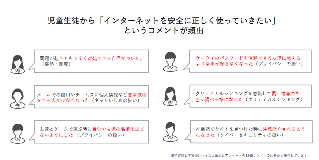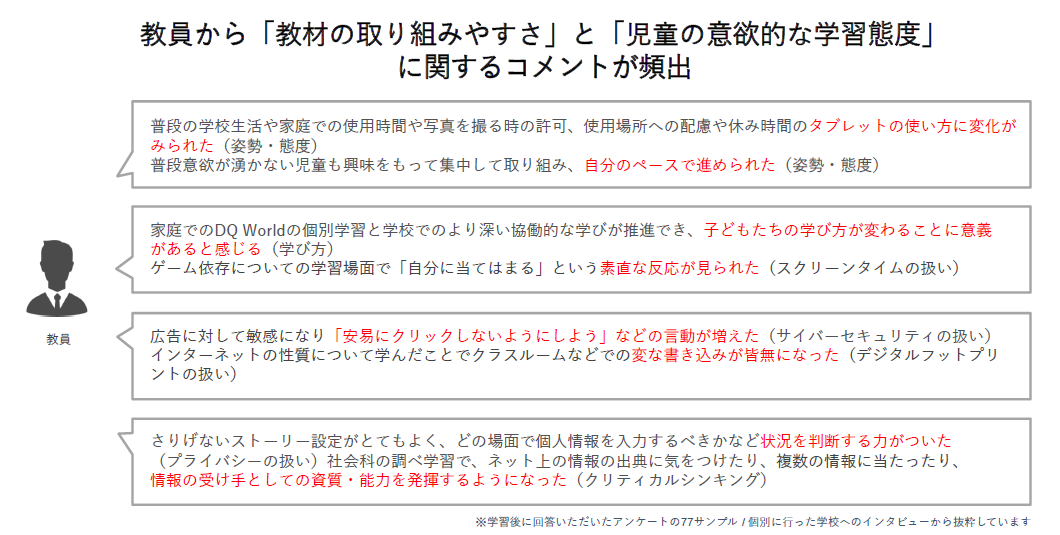 一方で、事後アンケートでは70%以上の教員が上記の不安を解消できたと回答。不安の大幅な改善が実現できた理由として、マーケティング担当の村上は「授業準備など先生方の負担を強いることなく児童生徒主体で取り組める点や、学習項目が明確な点など、DQ Worldの特質である扱いやすさが課題や不安の解消に繋がったのでは」と述べた。教員からは「ネット広告に対し敏感になり、安易にクリックしないようにする生徒が増えた。」や、「調べ学習の時間で、ネット上の情報の出典を気にかけるようになるなど、クリティカルシンキングが身に付いた児童生徒が多く見られる」など、DQ Worldでの学習が実生活に生かされているといった声が上がった。
