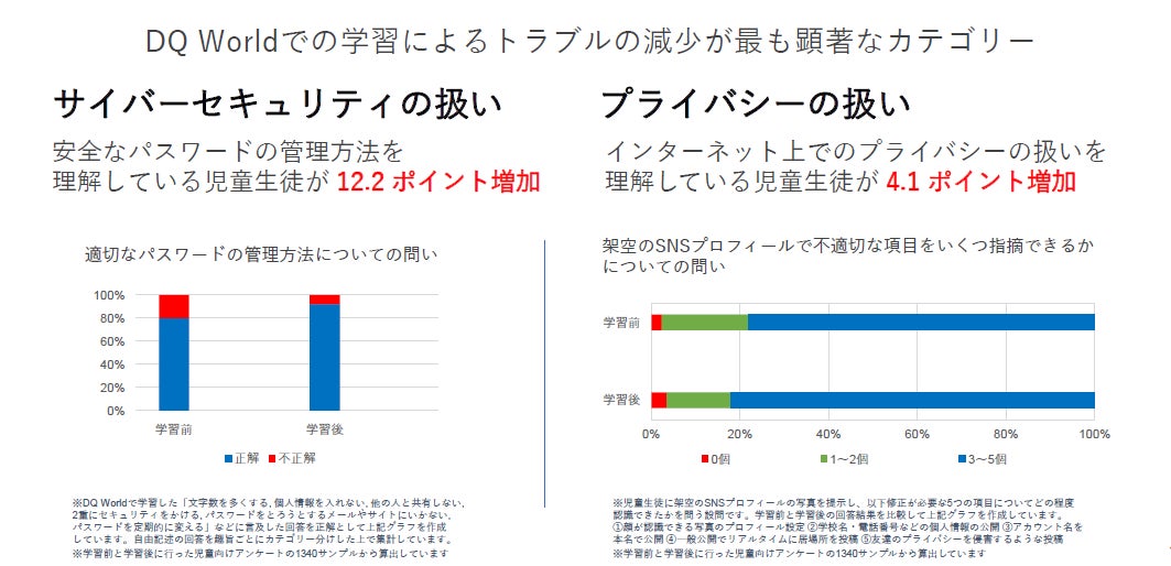 児童生徒への効果測定では、インターネット上でのトラブル関与率の減少、ウイルスなどから自分のアカウントを守るセキュリティに関する分野と個人情報の適切に管理するプライバシーに関する分野において効果を見せた。また、事前アンケートでは全体の10%の児童生徒がインターネット上でのトラブルに関与していたが、事後アンケートでは全体の5.1%に減少しており、約5割のトラブル関与率の改善が見られた。児童生徒からは「DQ Worldを学習する前はオンラインゲームで暴言を言ったり友人と喧嘩してしまっていたが、学習後は言葉遣いを優しくするよう心掛けるようになった」や「SNSへの投稿や閲覧の際の注意点を知ることができ、トラブルを回避できるようになった」などといった声が上がり、適切なICT活用の姿勢を習得しつつある様子が伺えた。