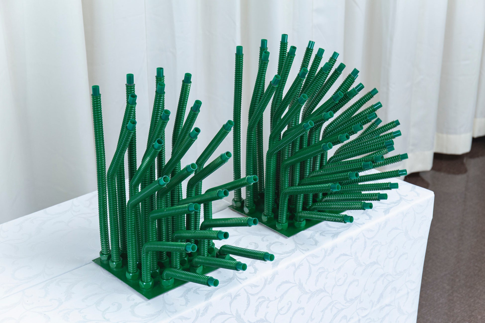 「だれdemo花祭壇」は、金属製パイプなどで構成された花祭壇専用の装花ベースです。パーツ分割ができる仕様のため、運搬の負担軽減にも期待できます。パイプには水道管などに使用されるフレキシブルパイプを採用しているため曲げることができ、花の位置の微調整も可能。保水はプラスチック製の試験管に水を入れ、その試験管をパイプに装着することで対応しています。また、各パーツは、造花のグリーンが取り付けられた状態で納品されます。
