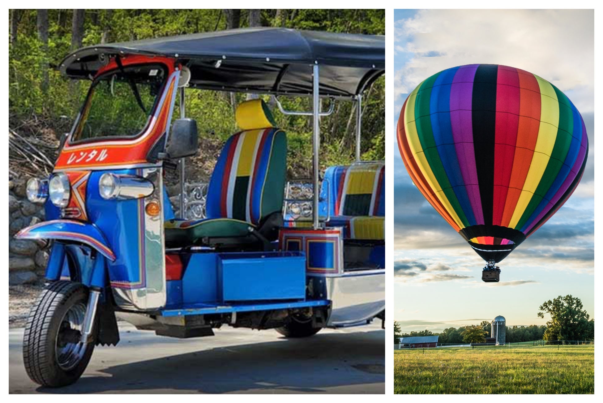 長瀞駅から会場までの移動は、東南アジアの街でおなじみの可愛らしいオート三輪車タクシー「トゥクトゥク」!!日曜日は会場内で「熱気球」の乗車体験も行う予定です。※有料・諸条件あり
