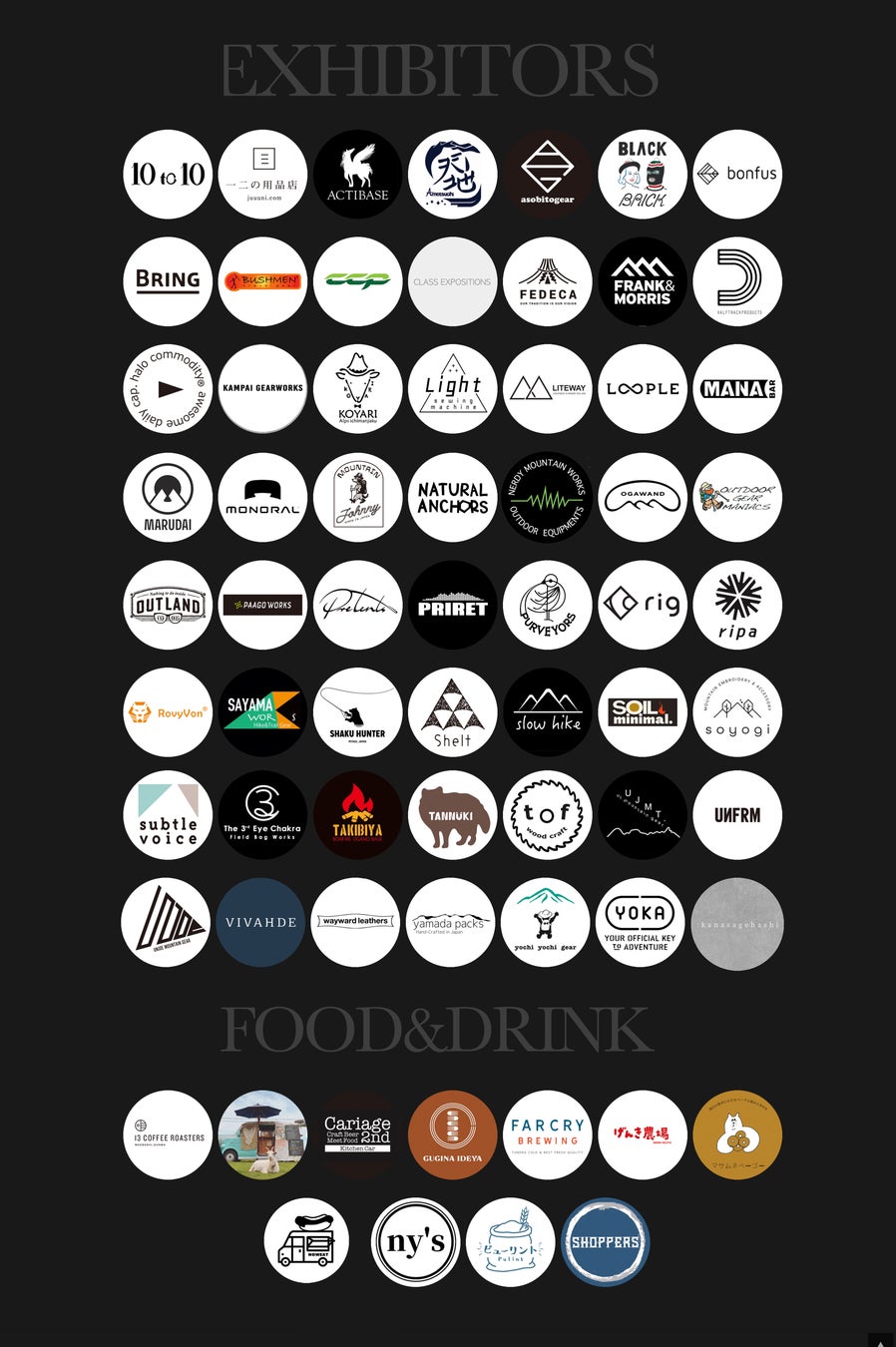 「10to10」「一二の用品店」「ACTIBASE」「Ametsuchi」「asobitogear」「BLACK BRICK」「BRING」「BUSHMEN Travel Gear/ SOIL minimal.」「CCP」「City to Summit」「CLASS EXPOSITIONS」「FEDECA」「FRANK&MORRIS」「halo commodity」「Kampai Gearworks」「山の工房 KOYARI」「+++Light sewing machine」「LITEWAY / RovyVon」「MARUDAI」「MONORAL」「MOUNTAIN JOHNNY」「NATURAL ANCHORS」「OGAWAND」「OUTDOOR GEAR MANIACS」「OUTLAND」「PAAGOWORKS」「Pre Tents」「PRIRET」「Purveyors」「rig footwear」「ripa」「SAYAMA works」「Shelt/Bonfus」「slowhike」「subtle voice」「The 3rd Eye Chakra」「TAKIBIYA」「TANNUKI」「tof wood craft」「UJMT.」「UNFRM OUTDOOR STANDARD」「UNJOE GEAR」「VIVAHDE」「yochi yochi gear」「YOKA」