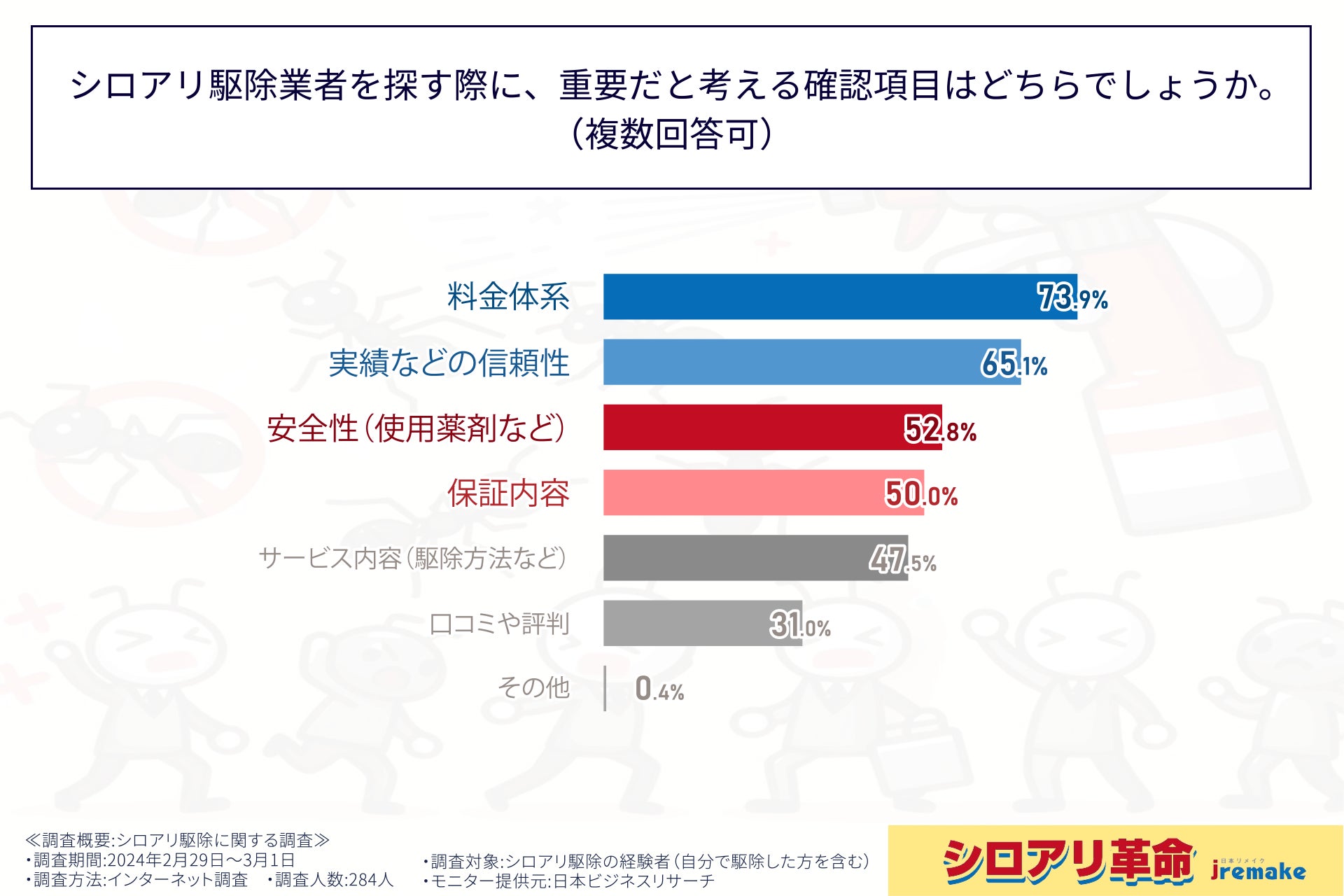 今回の調査により、シロアリ駆除経験者の約70%が駆除業者選びに「料金体系」を重視していることが明らかになりました。
