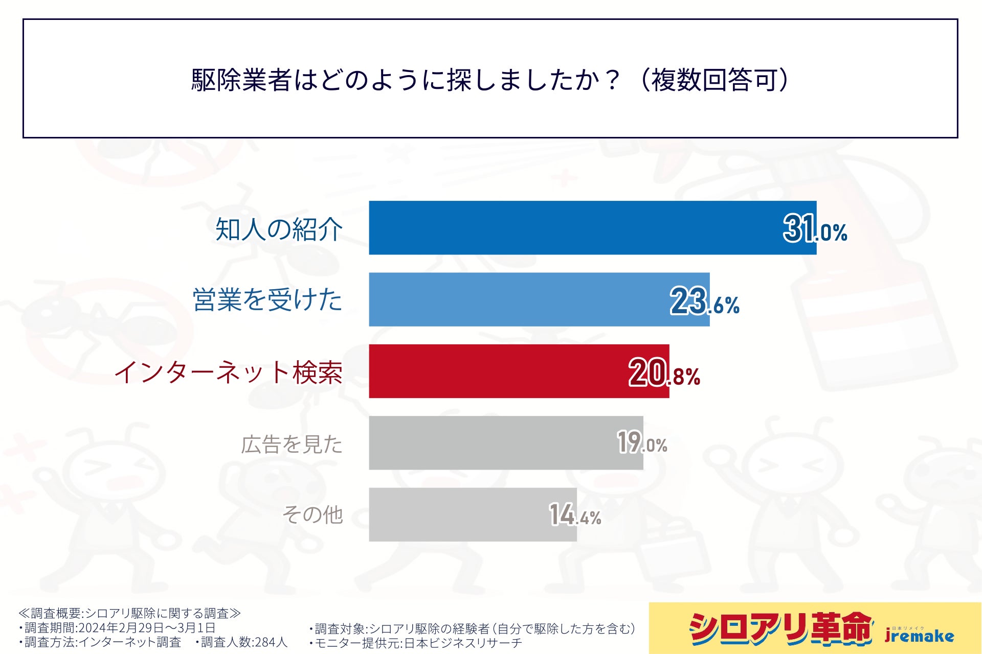 次に、シロアリ駆除を業者に依頼した284名に対し、駆除業者の探し方について調査しました。