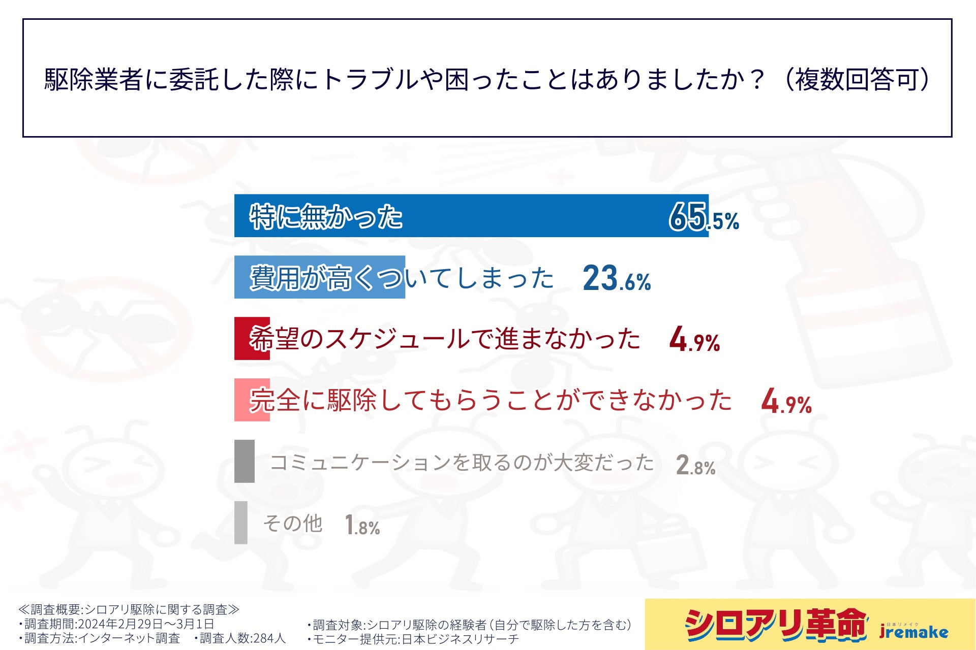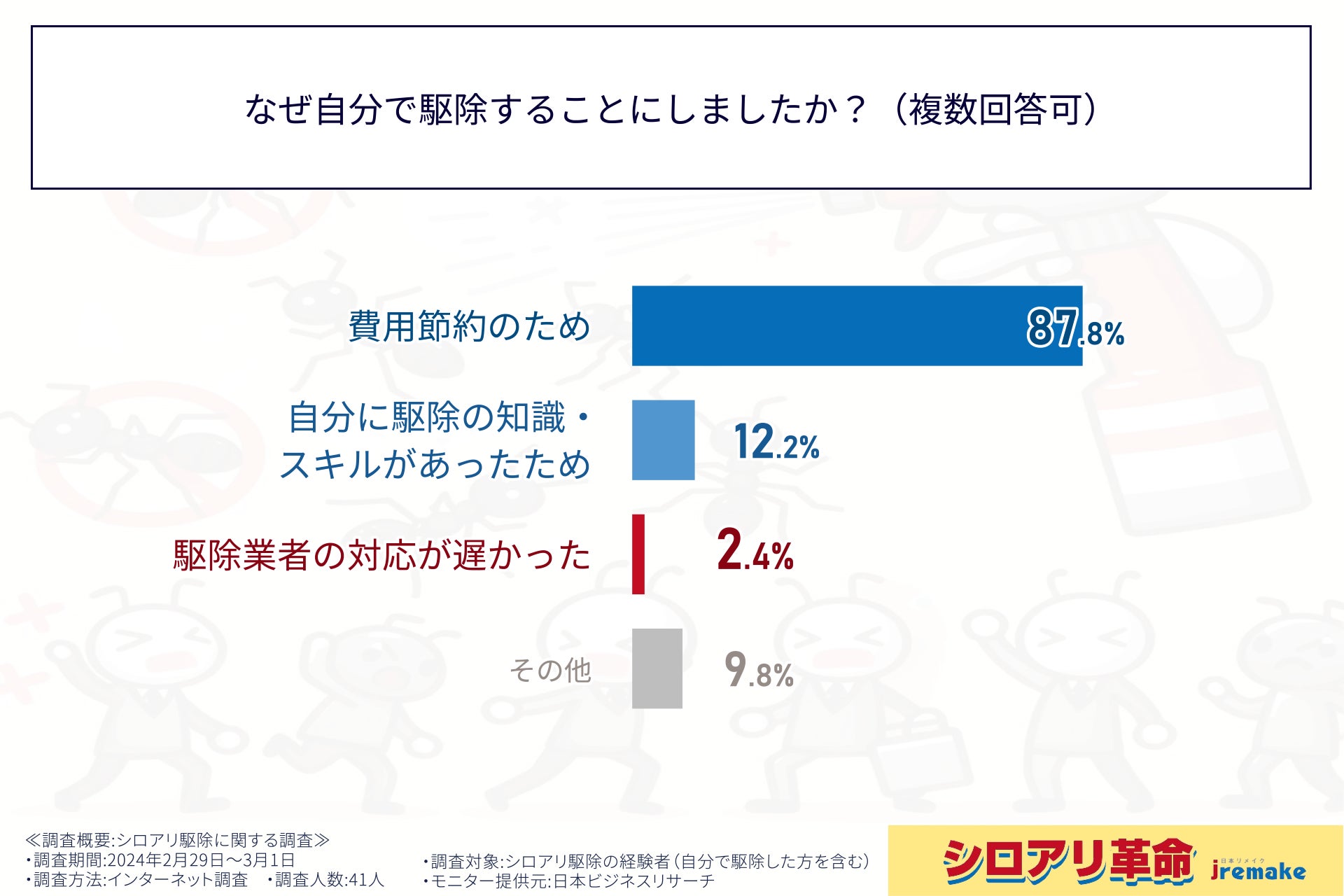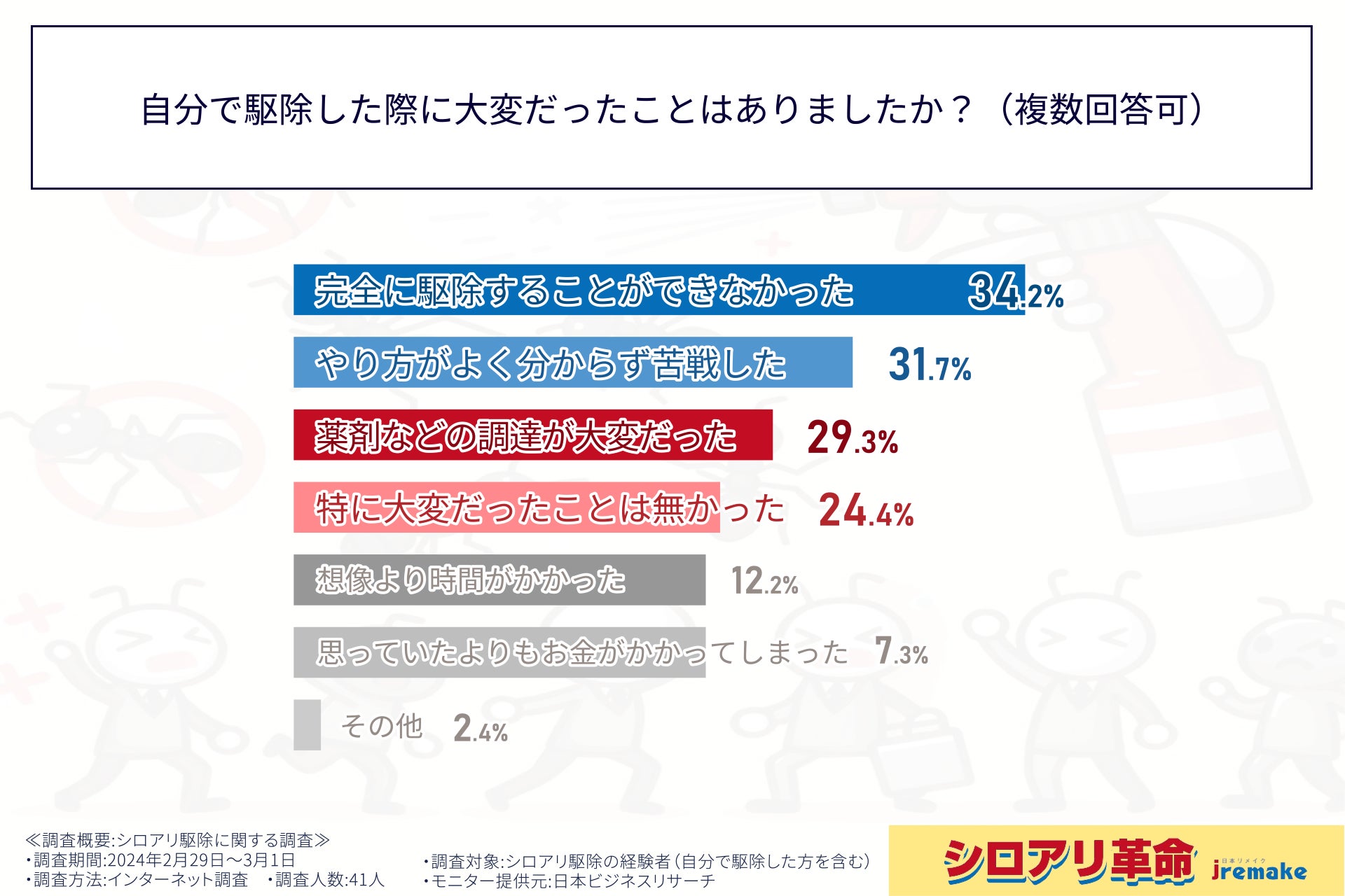 そこで、株式会社日本リメイクは、シロアリ駆除の経験者(自分で駆除した方を含む)に対し、シロアリ駆除に関する調査を実施しました。