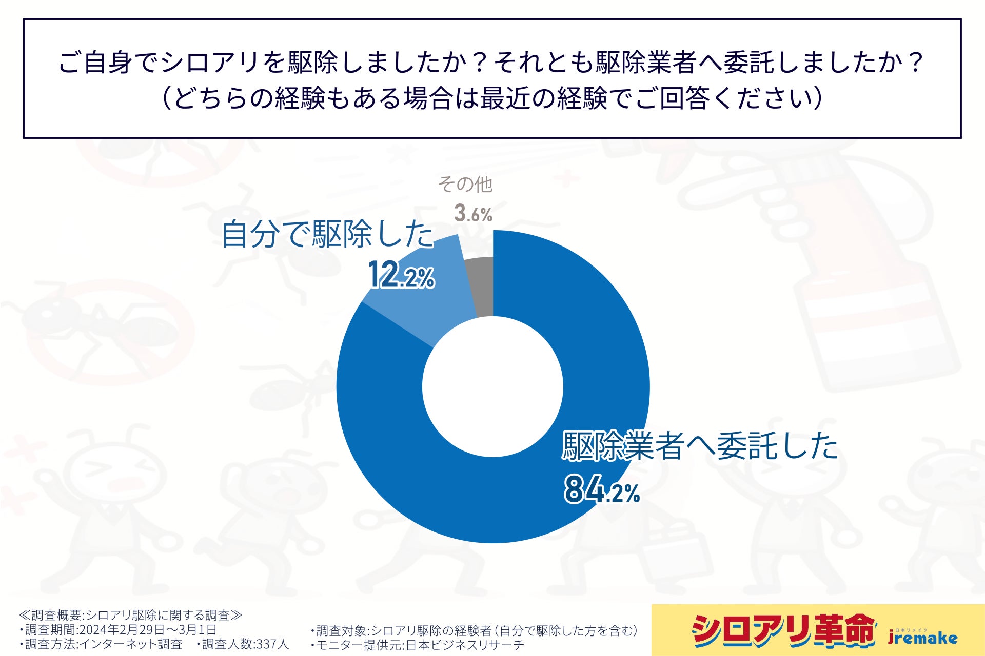 株式会社日本リメイク(所在地:埼玉県さいたま市、代表:鈴木俊雄)は、この度、シロアリ駆除の経験者337人を対象に、シロアリ駆除に関する調査を実施しましたので、お知らせいたします。