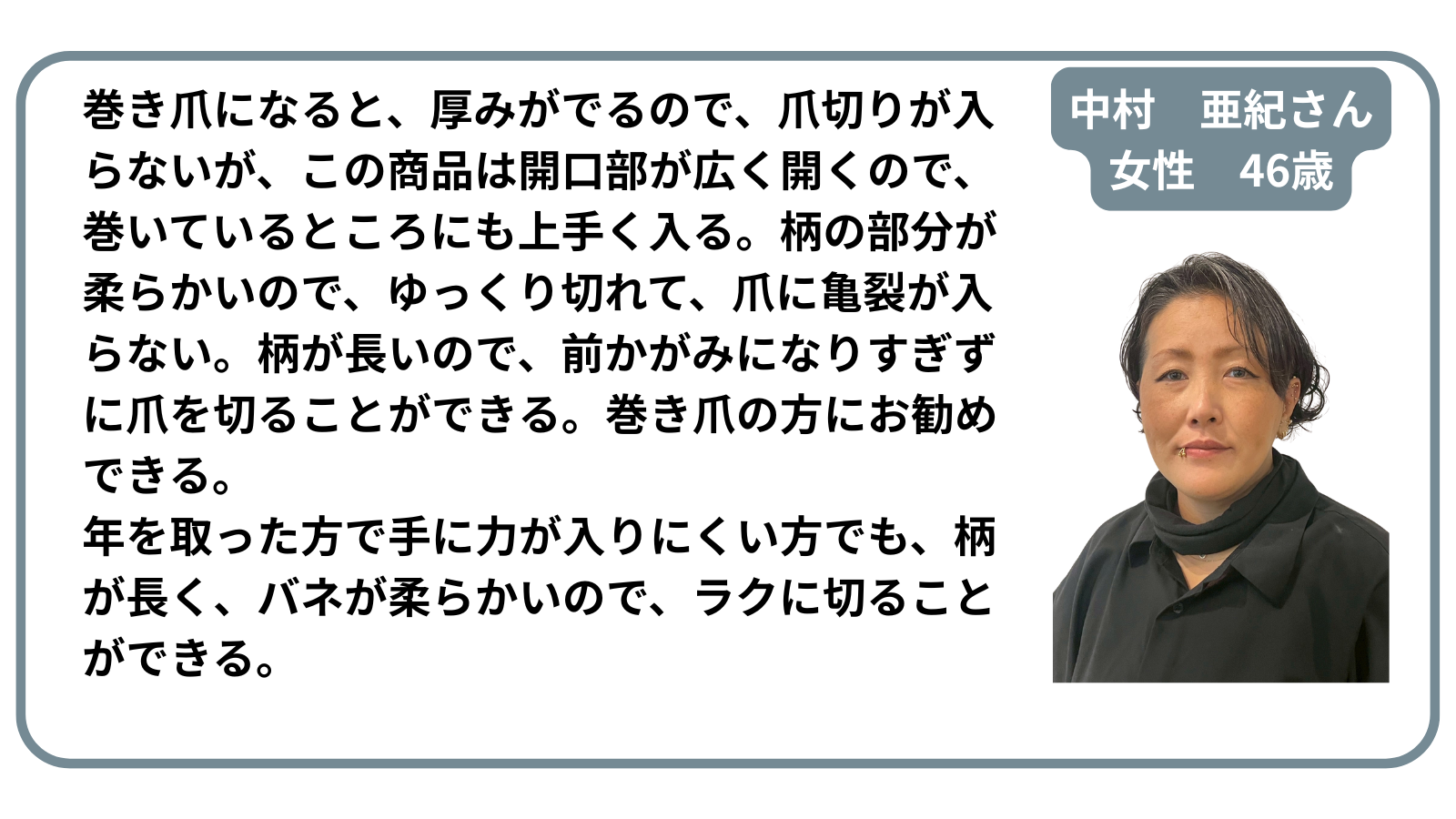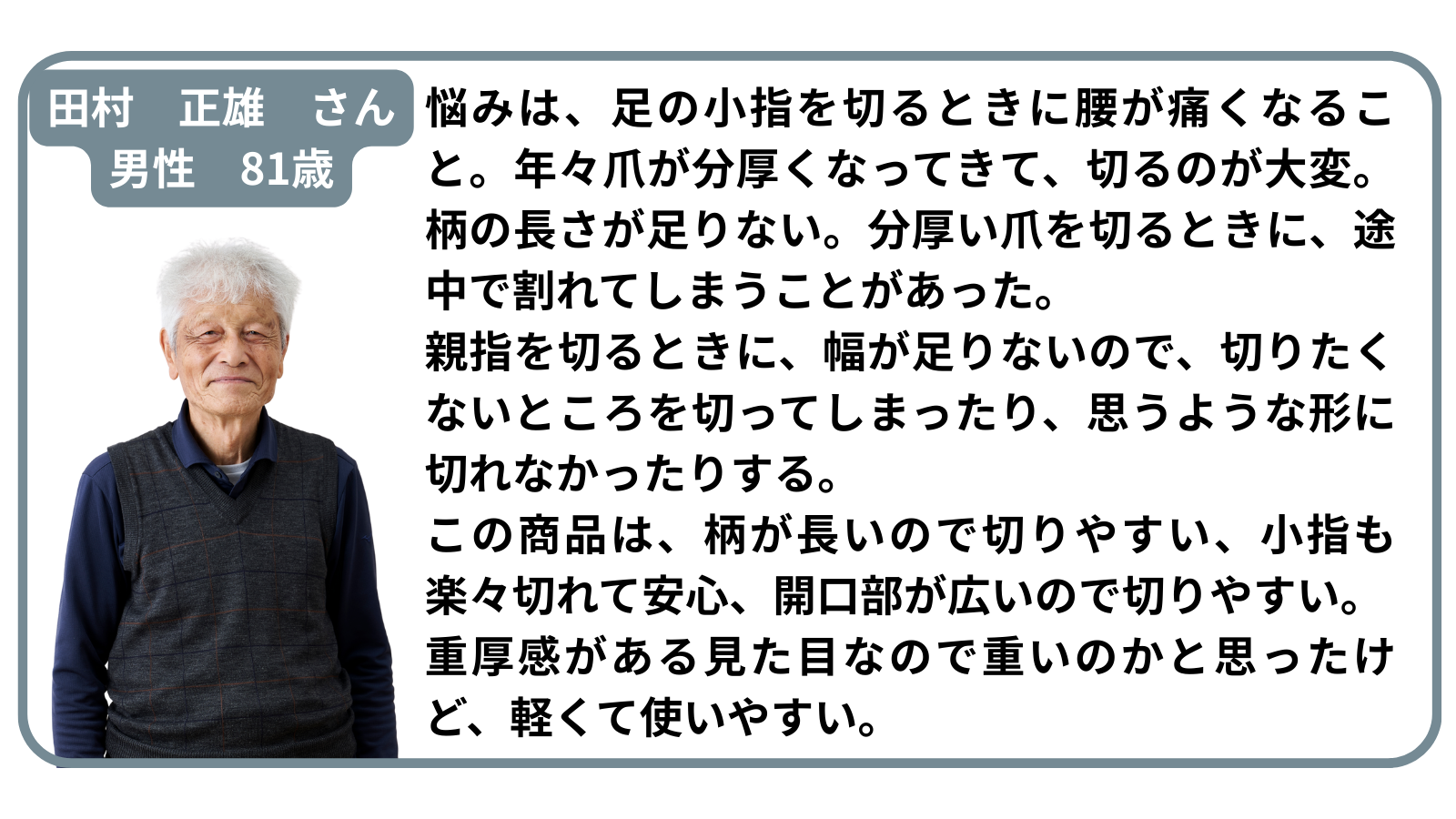 「爪が硬すぎて怖くて切れなかった父の爪も、この爪切りなら私が切ってあげられそうです。」