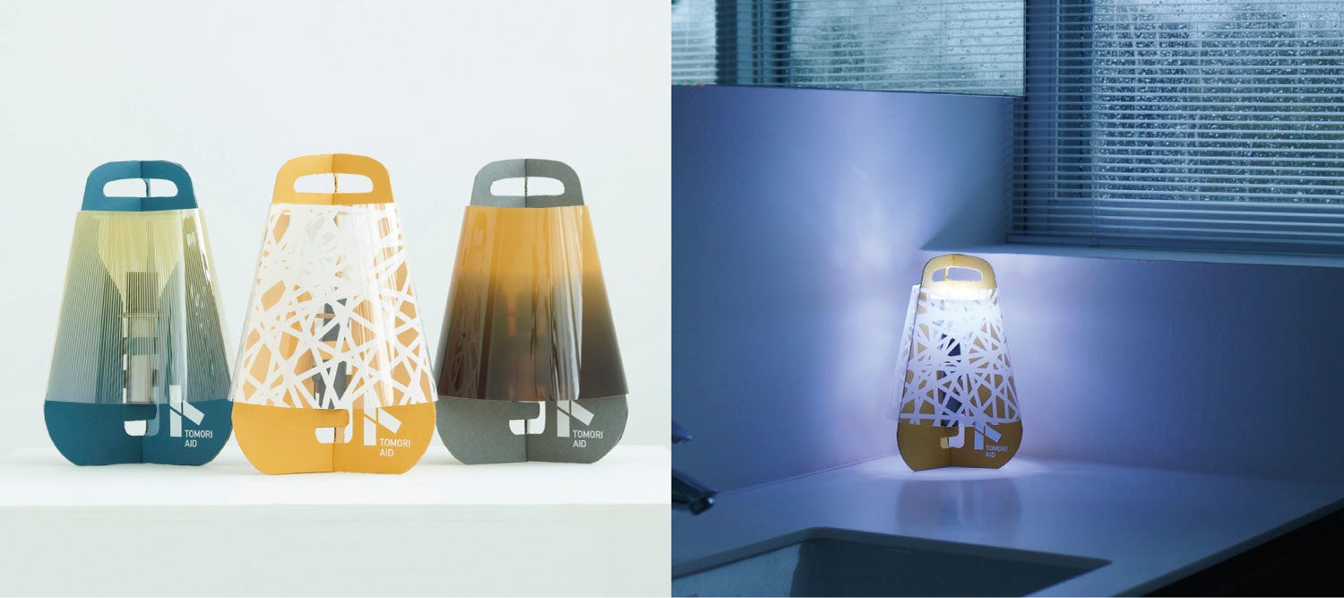 「TOMORI AID」は、組立てて懐中電灯をいれる事で直線的な光をランタンの様なやわらかな光にできる段ボール製照明キットです。「避難時に防災バッグに入れて持ち運べる携帯性」と「飾りたくなるデザイン性」を兼ね備え、日常のあかりとしても、災害時のあかりとしても活用できます。さらに、既に持っている懐中電灯を「入れ替えて使い続ける」事ができる防災照明です。