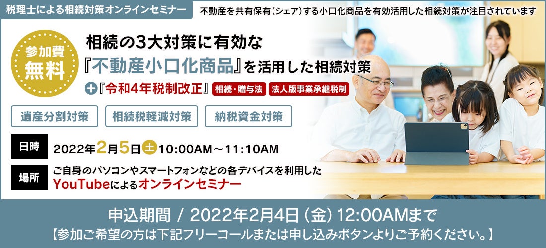 また、今回は不動産小口化商品の解説に加え『令和4年税制改正』による相続、贈与税の非課税措置の延長と法人場事業承継税制の特例承継計画の提出期限延長等についても詳しく解説いたします。