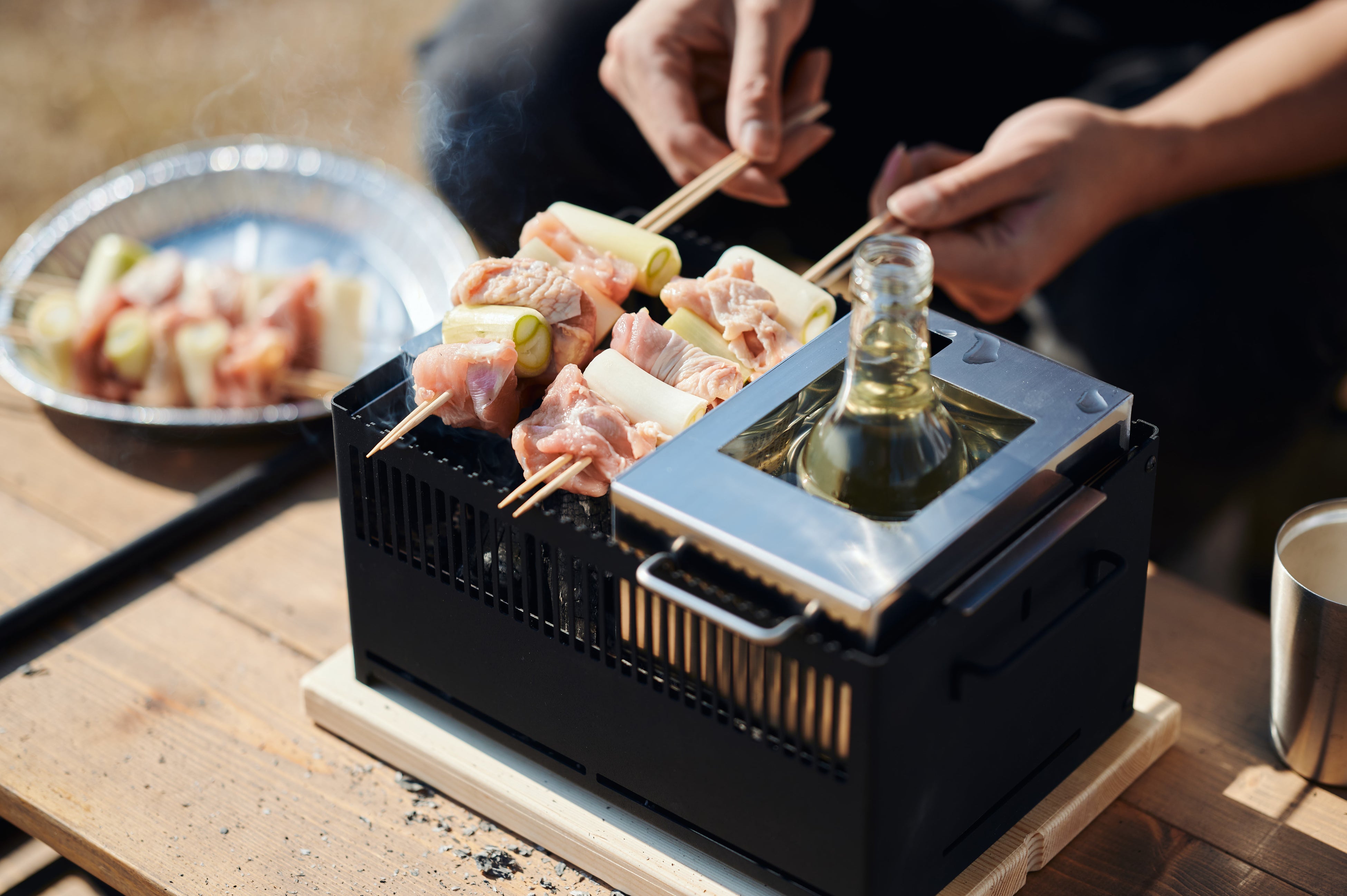 「+ Base」は串焼き・網焼き・鉄板焼き・煮込み・蒸し・燻製・熱燗など本格的な調理を一台で行うことができるオールインワン炭焼き器です。卓上に置けるコンパクトなモジュール構造とお手入れしやすい機能的デザインによって、キャンプはもちろん庭先でも手軽に使うことができます。「大切な人と過ごす時間」「一人でくつろぐひと時」…贅沢な体験を提供してくれるアイテムです。