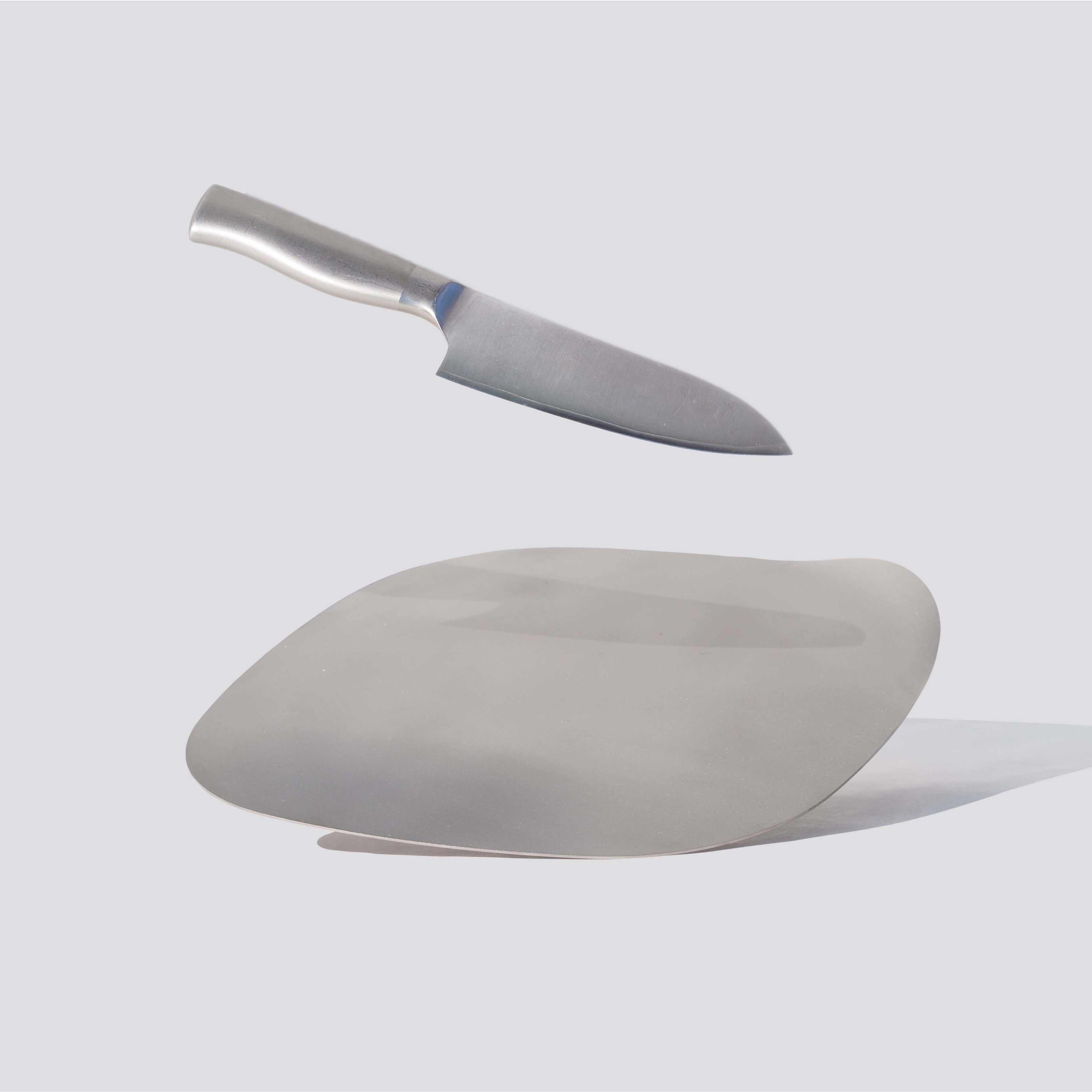 ハンドリングに優れるチタンのまな板。わずか215gと超軽量、一隈が緩やかにめくれて持ち上げやすくキッチンで小回りがききます。食材の匂い移りもなく、錆、黴の心配がありません。水気をすぐに拭き取れるので湿らせたくない食材のカットにも適していたり、切ってそのままテーブルへのフードプレートとしても使用できます。