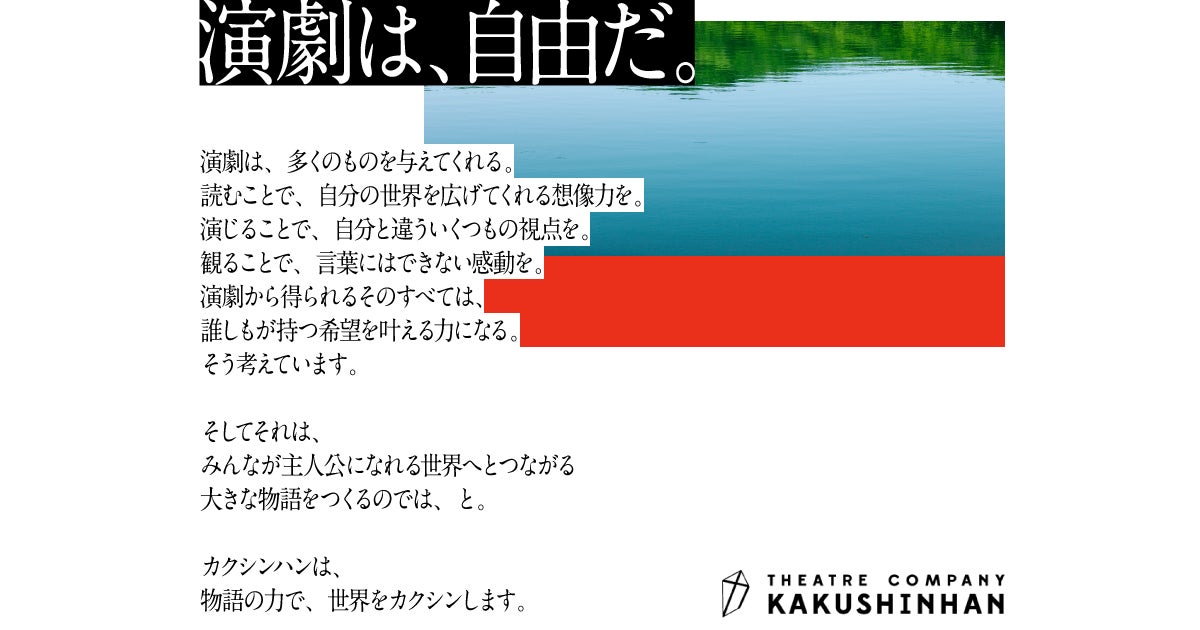 | https://kakushinhan.org/ https://twitter.com/kakushinhan カクシンハン主宰 / 演出家 / 株式会社トゥービー代表:木村龍之介 https://twitter.com/ryunosuke_kimur ※カクシンハン 木村龍之介主宰の演劇研究所「カクシンハン・スタジオ」 https://studio.kakushinhan.org/ |