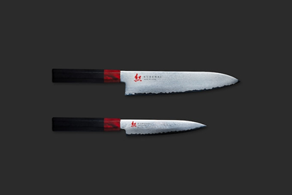 「KURENAI」の包丁コレクションは、現在牛刀とペティナイフの2種類で展開されており、耐久性と一般家庭でのメンテナンスの容易さを重視した機能性を持ちながらも、ダマスカス模様による美しい見た目を兼ね備えたコレクションです。