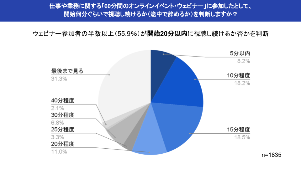 - ウェビナー参加経験者の55.9%がウェビナー開始20分以内に視聴継続するか否かを判断する