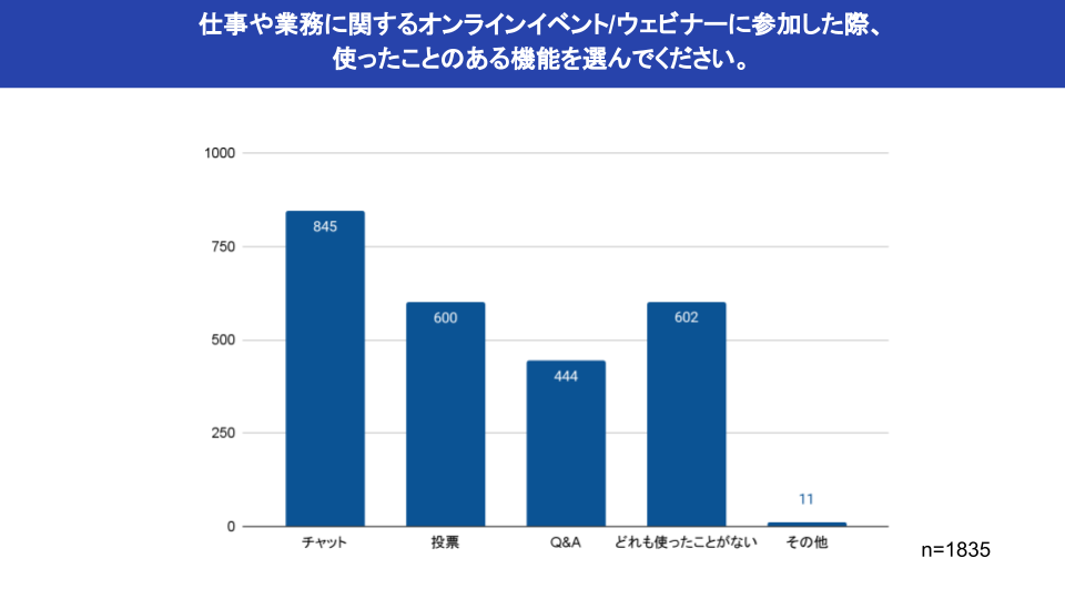 仕事や業務関連のウェビナーに1回以上参加したことのある人を対象に「仕事や業務に関するオンラインイベント/ウェビナーに参加した際、使ったことのある機能を選んでください。」と質問したところ、回答対象者1,835名中845名が「チャット」を選択し最多となりました。一方で602名が「どれも使ったことがない」と回答し、ウェビナー参加経験者の約3割が「見るだけ参加」になっていることがわかりました。