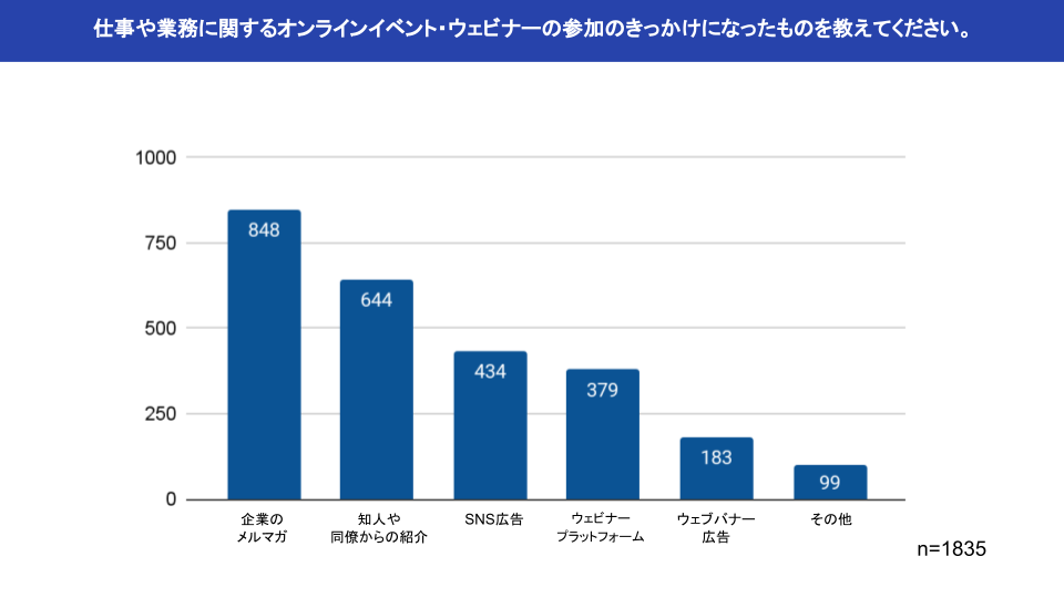 最後に、ウェビナー参加のきっかけについては「企業のメルマガ」と「知人や同僚からの紹介(SNSでの投稿含む)」が上位となり、ホワイトペーパーのダウンロードなど日々のマーケティング活動が重要であることが改めて浮き彫りになりました。また、自分の知っている人からの情報の方が参加のきっかけとなりやすいことから、参加者がイベント情報をSNSで拡散したくなる仕組み作りや、知人を誘って参加してもらう施策が重要となります。