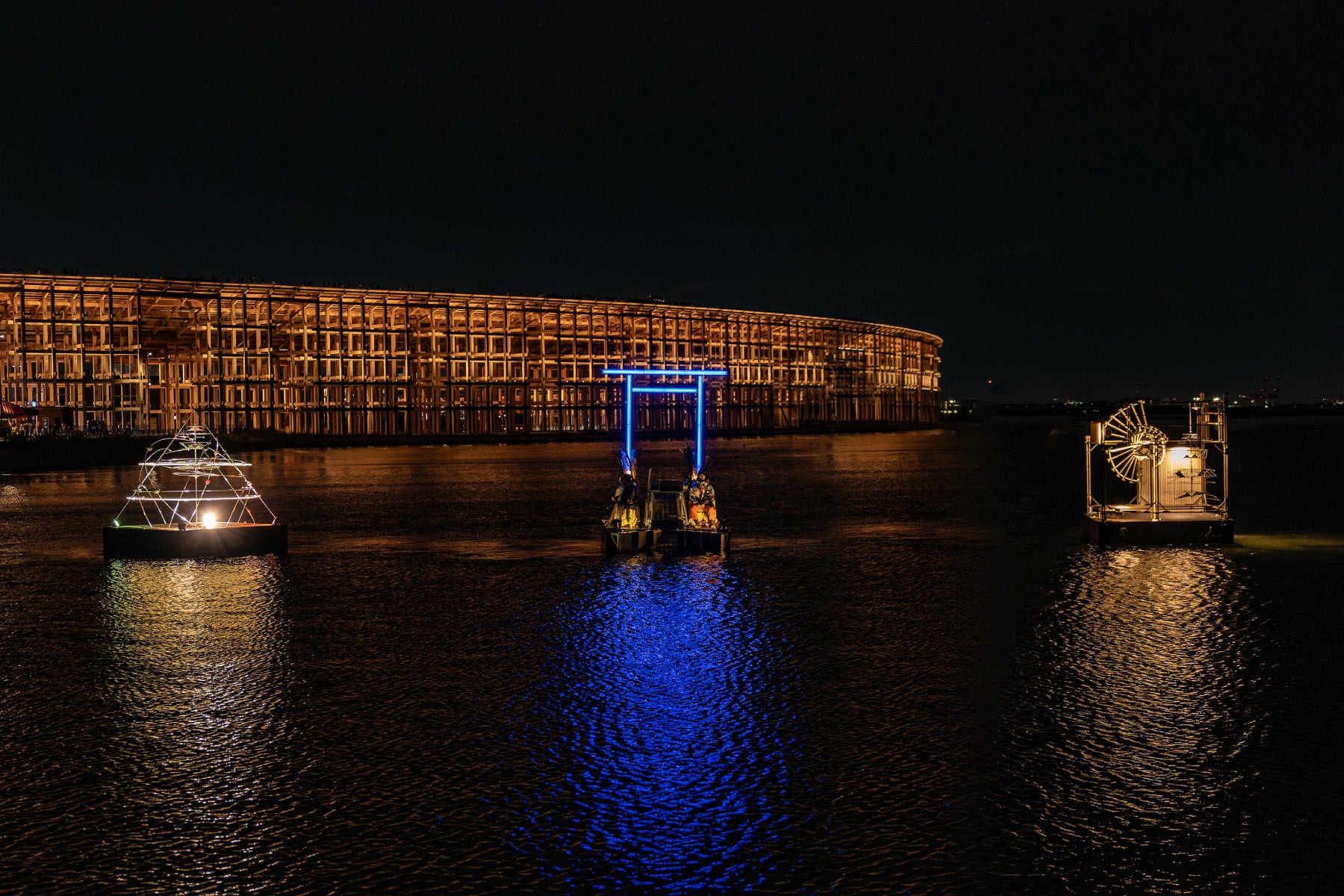 大阪・関西万博会場に浮かぶ、光る鳥居の正体は。人と宇宙の調和を表現した水上の空間彫刻作品群が10月12日まで展示中