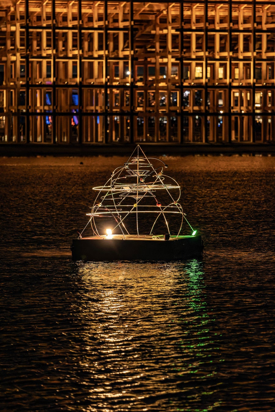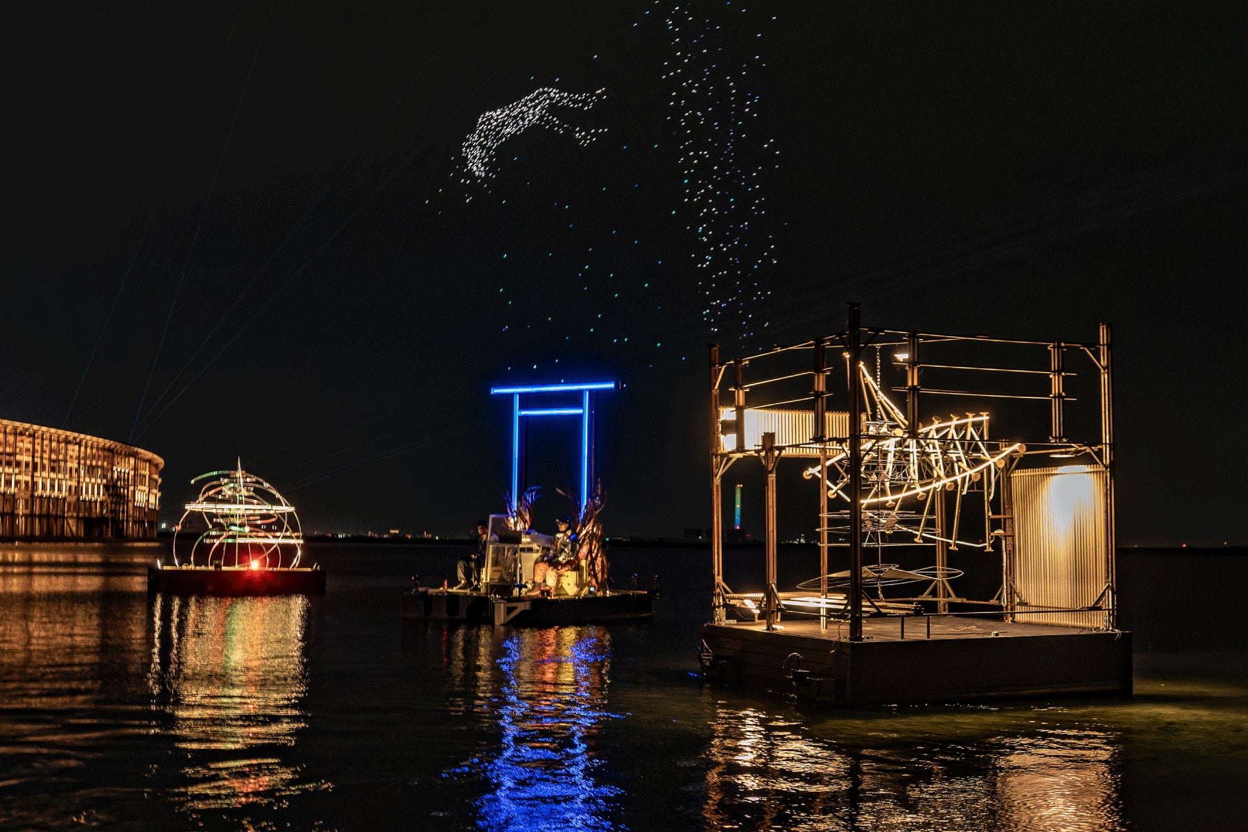 万博会場の水上に浮かぶこれらの作品は、海床(うみどこ)ロボットコンソーシアムによる環境配慮型の都市型自動運転船「海床ロボット」を活用して展示されています。
