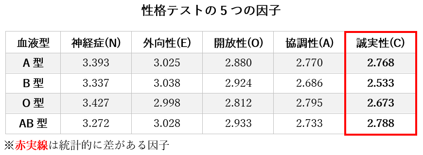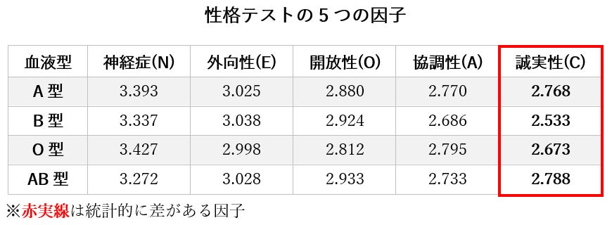 一方、性格の「5つの因子」については、1つの因子(誠実性)を除いて、血液型による統計的な差は認められませんでした。これは、従来の心理学の研究結果ともほとんど一致しません。このことは、性格テストが血液型による性格の差を正しく認識できないことを示しています。