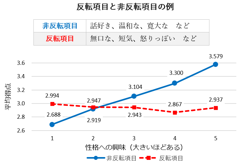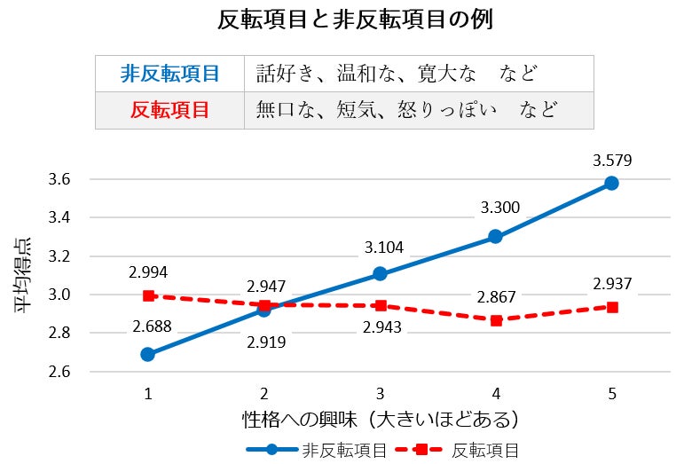 また、自分や他人の性格に興味がある人ほど、肯定的な特性(非反転項目)には高い得点を示す一方、正反対の特性(反転項目)の得点には変化はありませんでした。通常の性格テストの「5つの因子」は、非反転項目と反転項目の組み合わせで構成されています。このため、どの因子も自分や他人の性格に興味がある人ほど得点が高くなり、本来の性格とは必ずしも一致しないことになります。