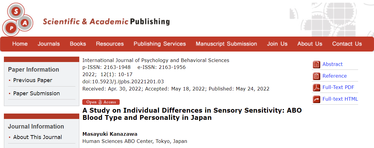 A Study on Individual Differences in Sensory Sensitivity: ABO Blood Type and Personality in Japan